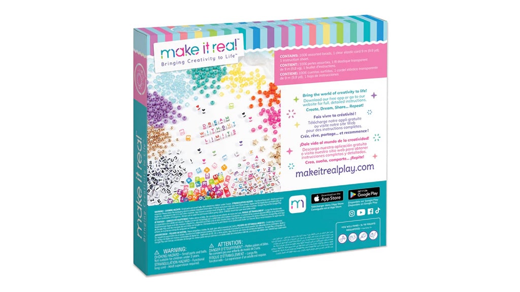 Setul conține doar mărgelele și șnurul, așa că vei avea nevoie de o foarfecă pentru a tăia șnurul la lungimea dorită. Pentru instrucțiuni detaliate și idei de proiecte, vizitează site-ul Make It Real sau descarcă aplicația lor gratuită din Google Play sau Apple App Store.