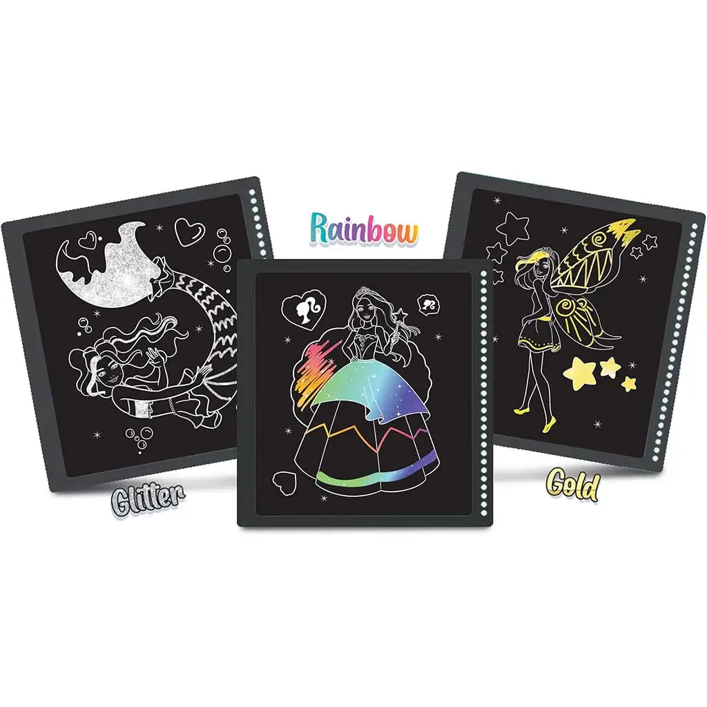 Setul de creație Barbie Mer-Mazing pentru realizarea imaginilor de zgâriat este visul fiecărui copil care adoră creația artistică, strălucirea și, bineînțeles, pe Barbie! Caietul spirală cu 44 de pagini este plin de surprize cu tematică marină, unde sirene, unicorni, zâne și prințese așteaptă să prindă viață sub mâinile copiilor. Paginile negre trebuie zgâriate cu un instrument special din plastic, astfel încât culori magice – precum auriu, sclipici sau curcubeu – apar la fiecare mișcare.