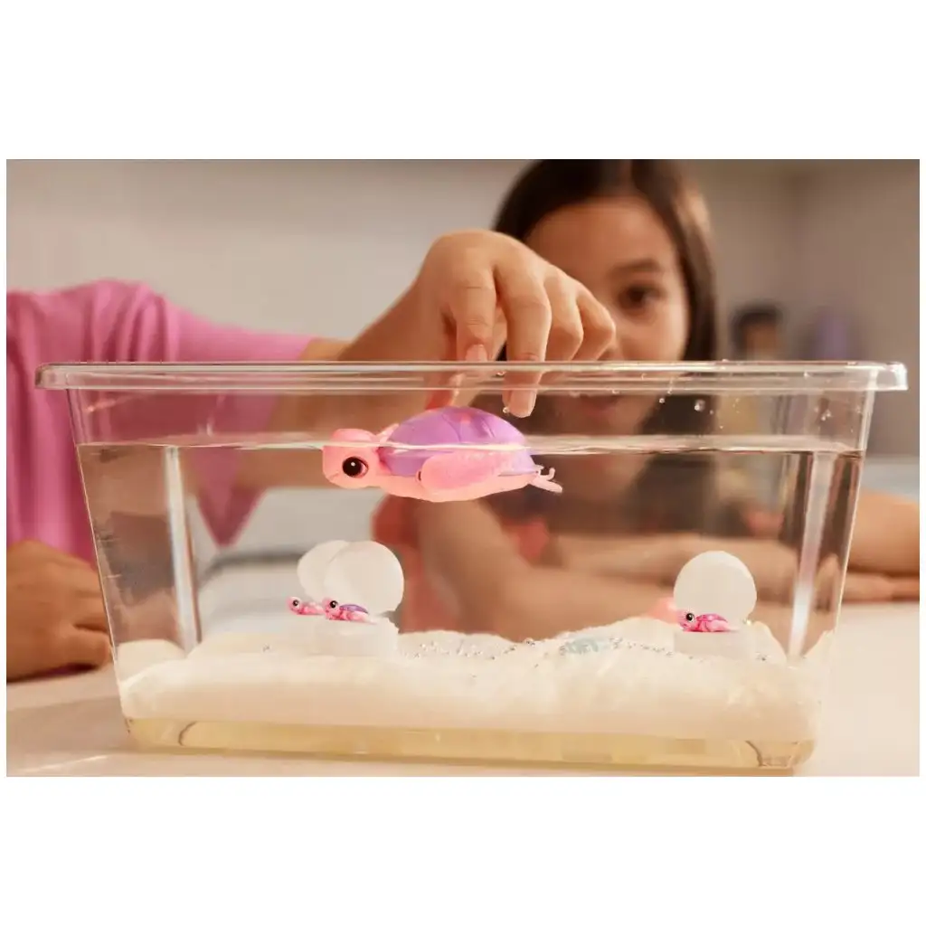 Marea broască țestoasă Mama este personajul principal al setului, care prinde viață atunci când este pusă în apă și chiar începe să înoate. Tot ce trebuie să faci este să umpli acvariul cu apă și poți urmări cum broasca țestoasă alunecă grațios prin apă. Însă nu doar înoată – poate merge și pe uscat, astfel copiii se pot ocupa de ea atât în apă, cât și pe uscat.
