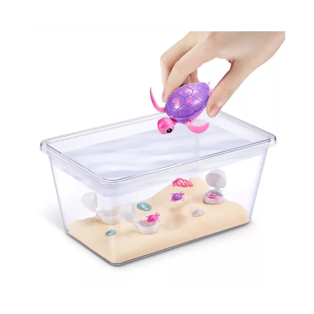 Conținut: 1 broască țestoasă Mama, 4 ouă surpriză (cu 2-4 pui de broască țestoasă), acvariu