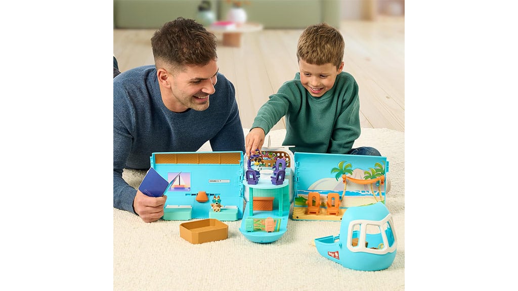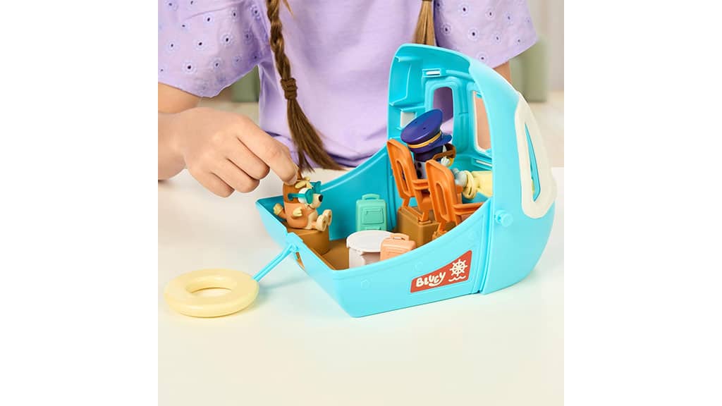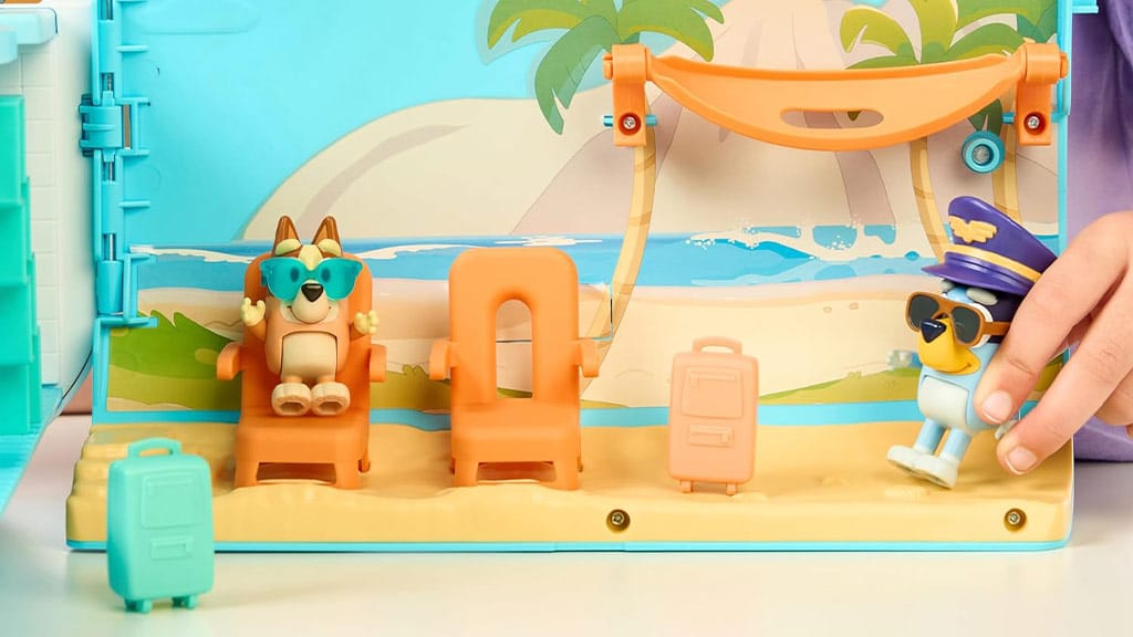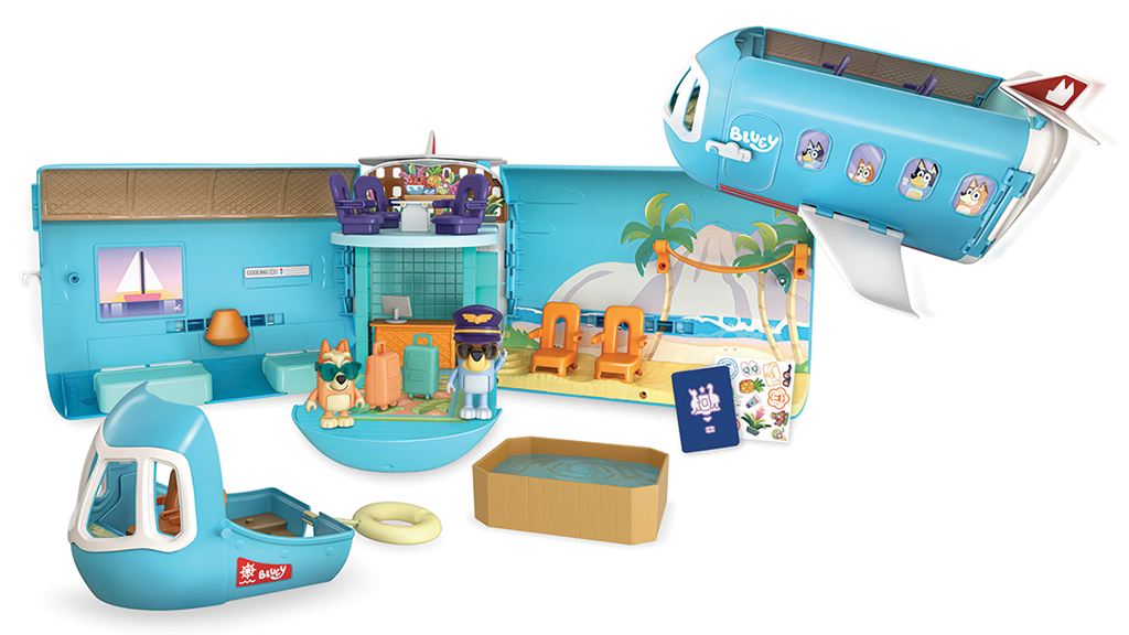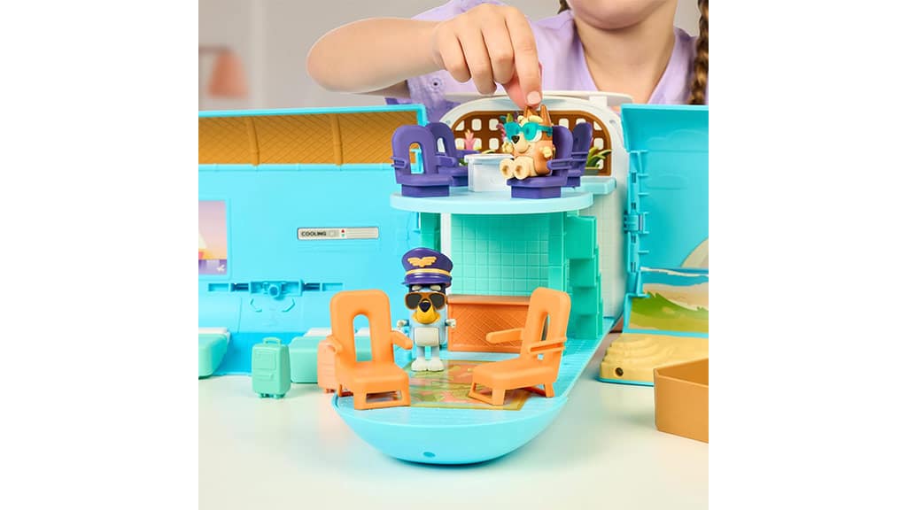Proiectat pentru copii, de la vârsta de 3 ani, acest set de joacă Bluey îi duce pe copii într-o aventură tropicală cu trei moduri de joc: un avion, o barcă cu un colac de înot atașat și un resort care include o cameră de hotel pentru patru persoane și o plajă! Setul include și două figurine exclusive – Bluey cu o șapcă de pilot și ochelari de soare, precum și Bingo cu ochelari de soare – cu care copiii pot recrea scene. Când copiii apasă butonul de pe spatele setului de joacă, redă peste 25 de sunete, expresii și muzică din emisiune. Copiii pot participa cu adevărat la aventură cu un pașaport australian, care vine cu o foaie de autocolante pentru decorare!