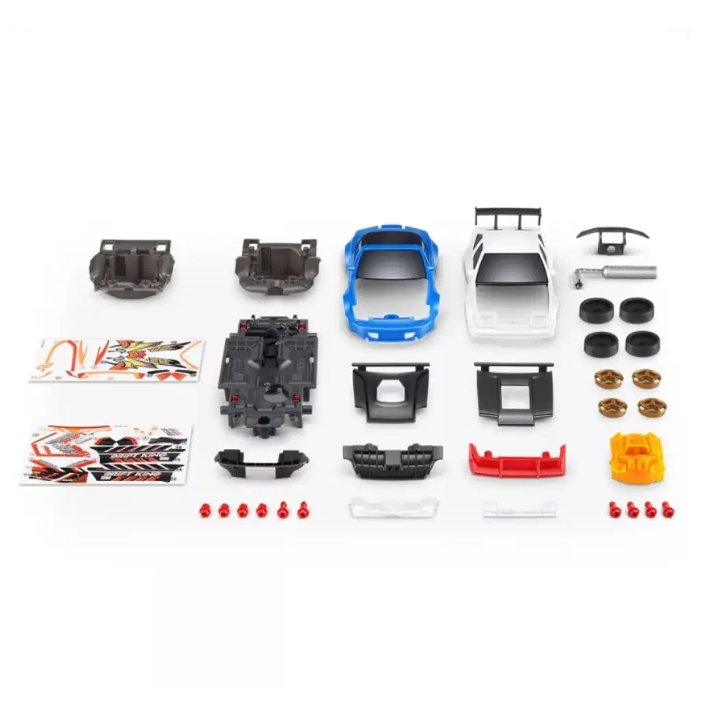 Piese incluse în set: șasiu, motor, 4 roți, 2 caroserii, slime, stickere