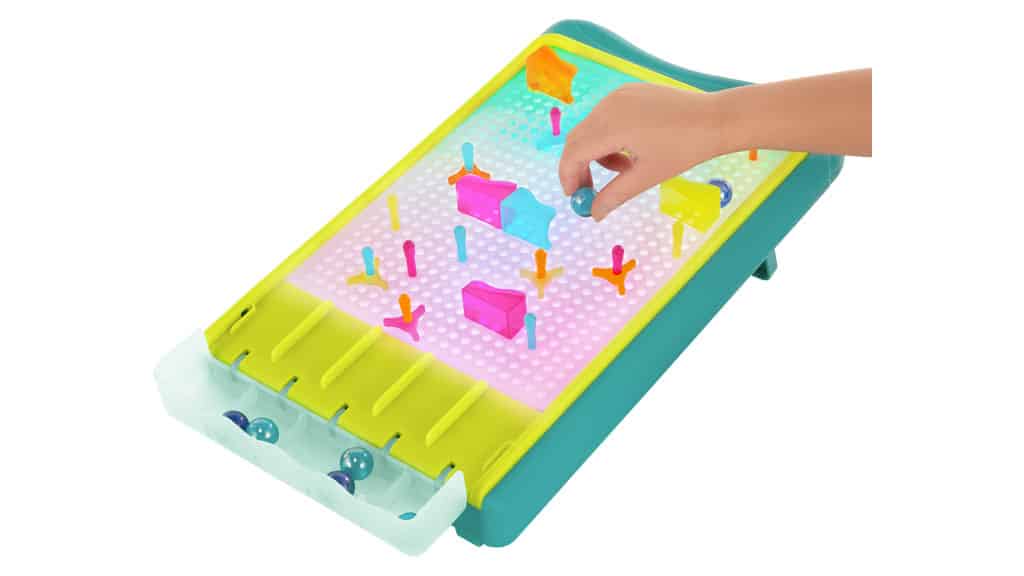 Setul de jocuri B. Toys Marble Drop - Marble Run combină un joc de stil arcade captivant cu o pânză de artă neon creativă. Acest joc all-in-one promite ore nesfârșite de distracție conștientă, deoarece combină creativitatea și îndemânarea. Copiii pot folosi piese colorate și unice pentru a-și construi propriul labirint de bile. Pe măsură ce bila parcurge labirintul, cade într-o secțiune de captare la bază, unde fiecare segment reprezintă valori de punctaj diferite. Câte puncte vei obține cu propriul tău labirint de bile?
