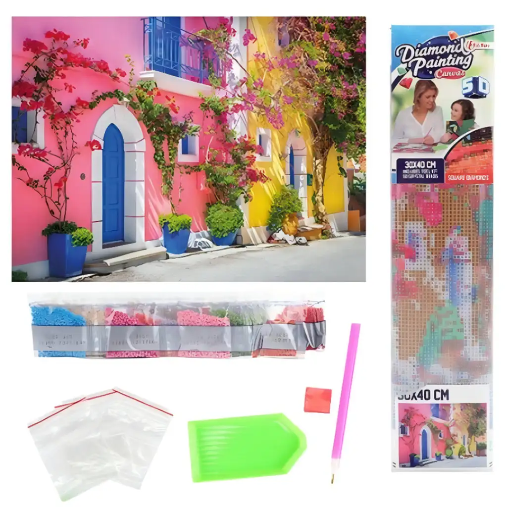 Setul de pictură cu diamante "Culorile Greciei" oferă o oportunitate de creație colorată și spectaculoasă, aducând farmecul insulelor grecești în casa ta. Acest puzzle cu diamante de 30x40 cm ilustrează o stradă idilică grecească, unde casele în culori vesele, ușile și ferestrele albastre, precum și priveliștea minunată a bougainvilleei care decorează pereții prind viață. Imaginea cu nuanțe vibrante de roz, galben și albastru evocă atmosfera însorită și mediteraneană a Greciei, fermecând pe oricine.