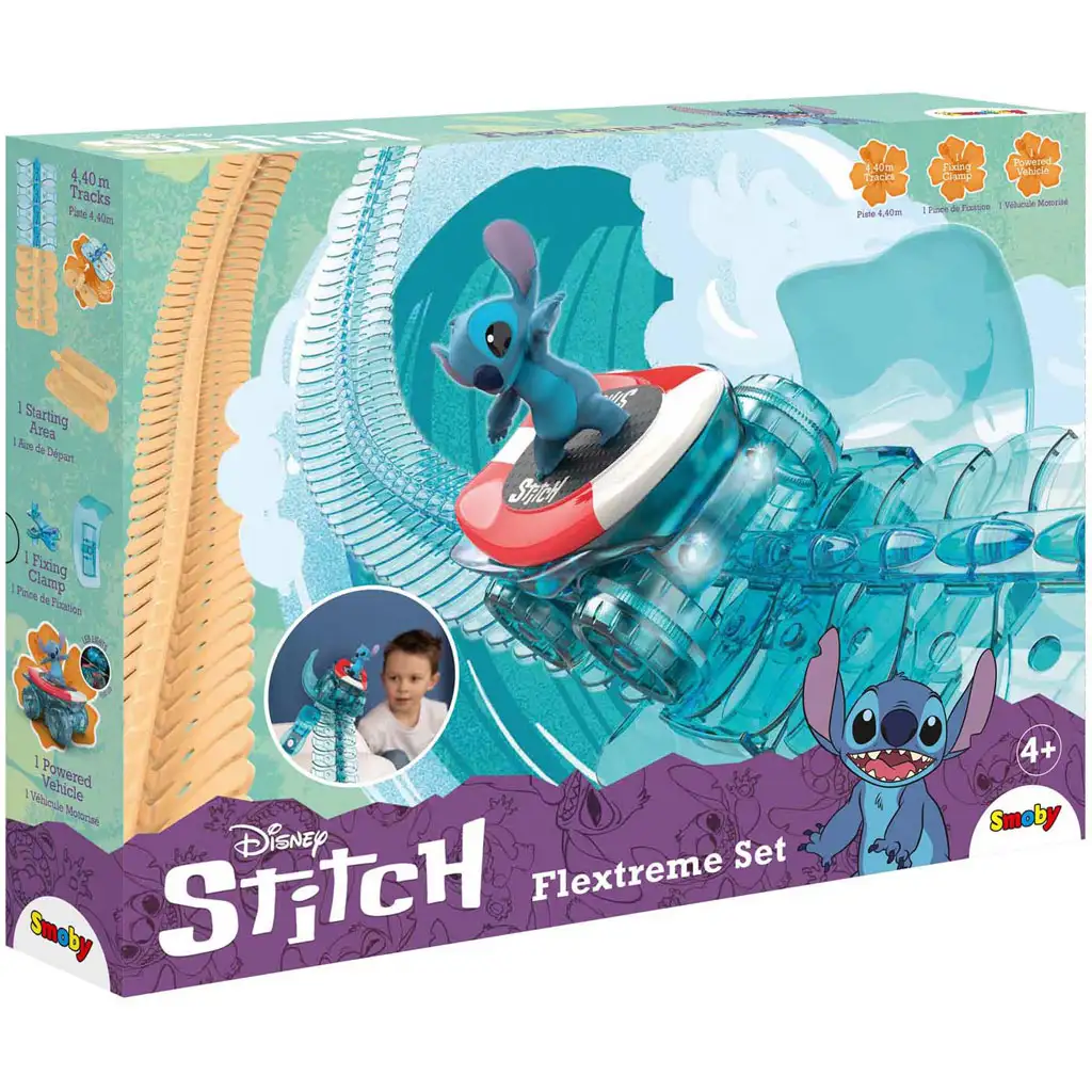 Segmentele speciale ale pistei, fabricate din plastic transparent, creează o pistă flexibilă de 4,4 metri lungime, pe care un vehicul motorizat circulă împreună cu figurina Stitch, care fuge pe o placă de surf. Vehiculul este prevăzut cu lumină, așa că jocul devine și mai spectaculos, mai ales pe întuneric! Clema pentru fixarea pistei și punctul de pornire sunt de asemenea incluse, astfel încât începutul cursei și fixarea stabilă nu reprezintă o problemă.