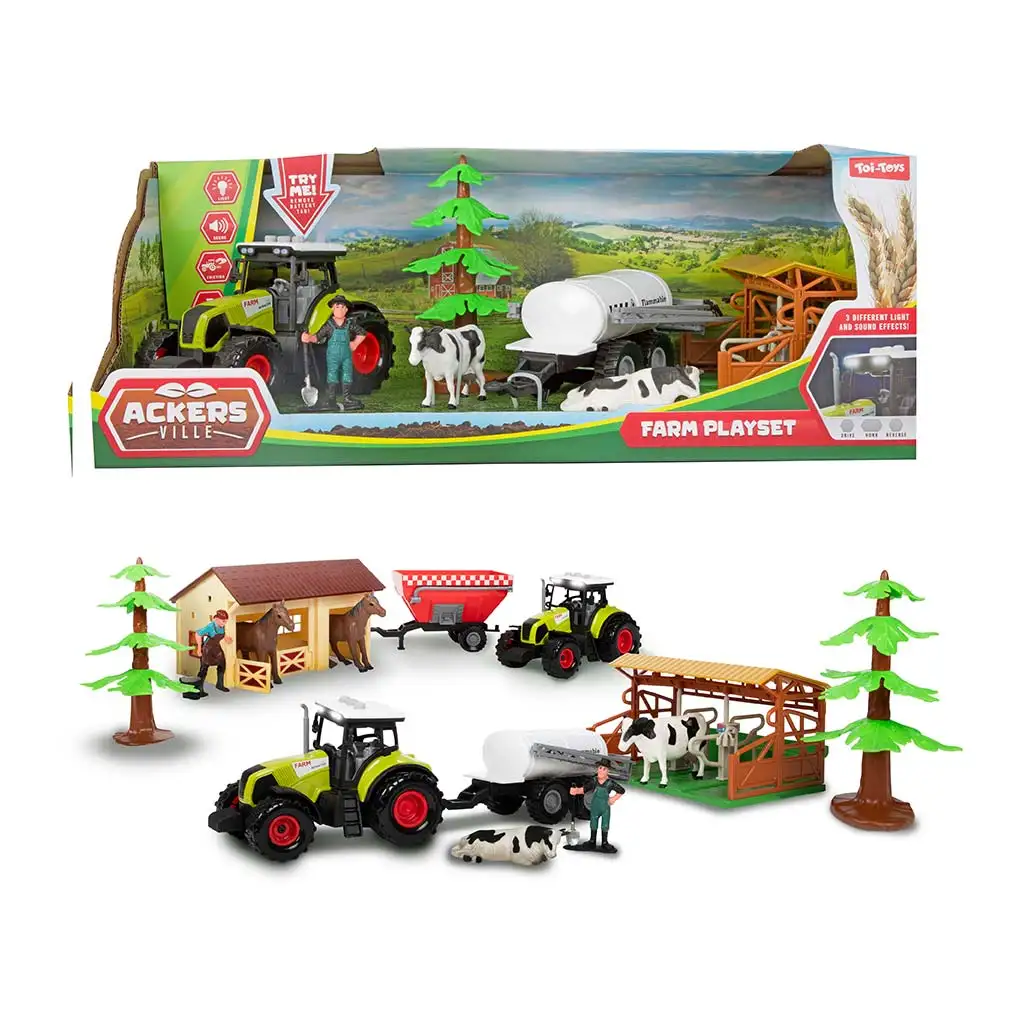 Setul conține un tractor cu remorcă, un grajd sau un țarc, precum și diverse figurine de animale și accesorii de fermă. Copiii pot juca scene precum hrănirea și îngrijirea animalelor sau diverse activități în jurul fermei. Jocul sprijină gândirea creativă și dezvoltarea jocului de rol, în timp ce cei mici pot învăța lumea agriculturii.