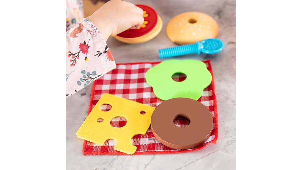 Ne place că acest set conține atât de multe elemente care îl fac distractiv, captivant și stimulant pentru cei mai tineri bucătari și iubitori de hamburgeri. De exemplu, în loc să primească un hamburger de jucărie dintr-o singură bucată, fiecare ingredient este prezent ca o piesă separată, permițând copiilor să personalizeze și să creeze diferite variații. Funcții cool, cum ar fi sosiera care schimbă între diferite sosuri și ingredientele de hamburger care pot fi înșurubate pe un băț de lemn, fac acest set mai distractiv și mai atrăgător decât un set tipic de mâncare de jucărie. Majoritatea pieselor sunt realizate din lemn și fetru, așa că avem încredere că acest set este de înaltă calitate și realizat cu detalii atent lucrate.