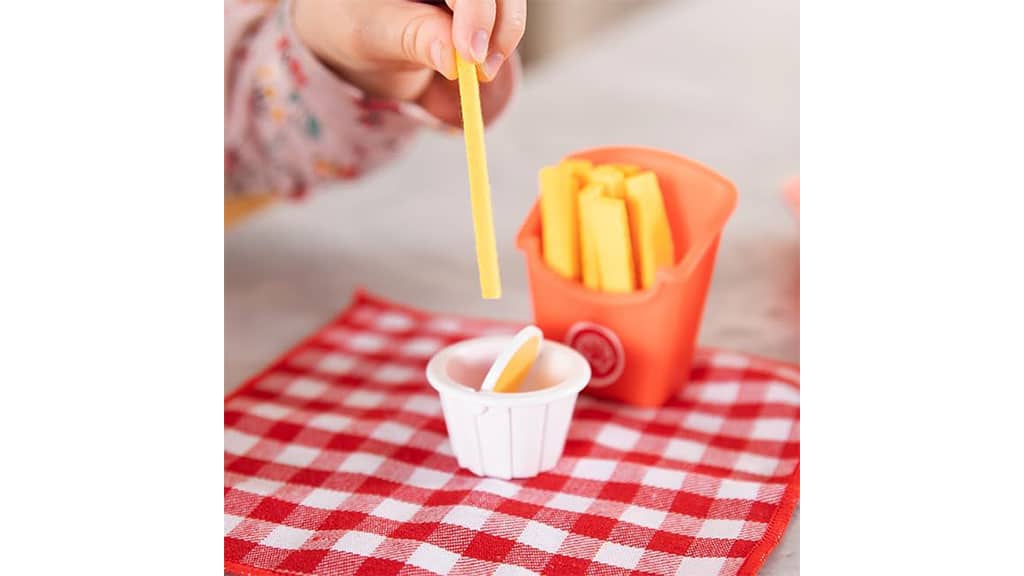 Copiii vor adora să înmoaie cartofii prăjiți din fetru în bolul cu sos, care alternează între muștar și ketchup, cu setul Pretendables Burger și Fries. Acest joc nu este doar distractiv, ci dezvoltă și imaginația și abilitățile motorii fine ale copiilor. Posibilitatea de a schimba între diferite sosuri le oferă copiilor ocazia să își imagineze diverse arome și texturi, în timp ce își creează creativ propria lume mică în timpul jocului.
