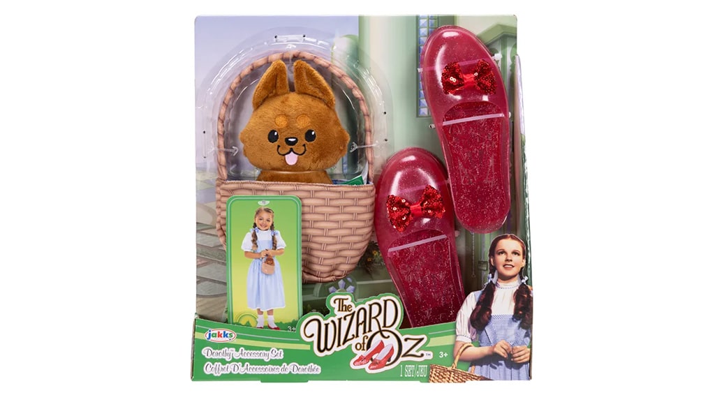 Setul de accesorii Dorothy completează ținuta: cu o pereche de pantofi roșii rubin, un coș și un căţeluş de pluș Toto. Acest set este alegerea perfectă pentru orice copil care iubește jocurile de rol pline de fantezie și poveștile clasice.