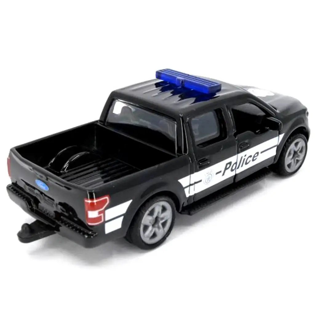 Ford F-150 este unul dintre cele mai cunoscute și populare vehicule off-road din Statele Unite, care nu doar că este puternic și robust, dar oferă și foarte mult spațiu. Varianta Siku este un autovehicul de poliție negru cu alb, cu girofar albastru pe acoperiș, uși care se deschid și grafică detaliată de poliție, care evocă atmosfera adevăratelor mașini de poliție americane.