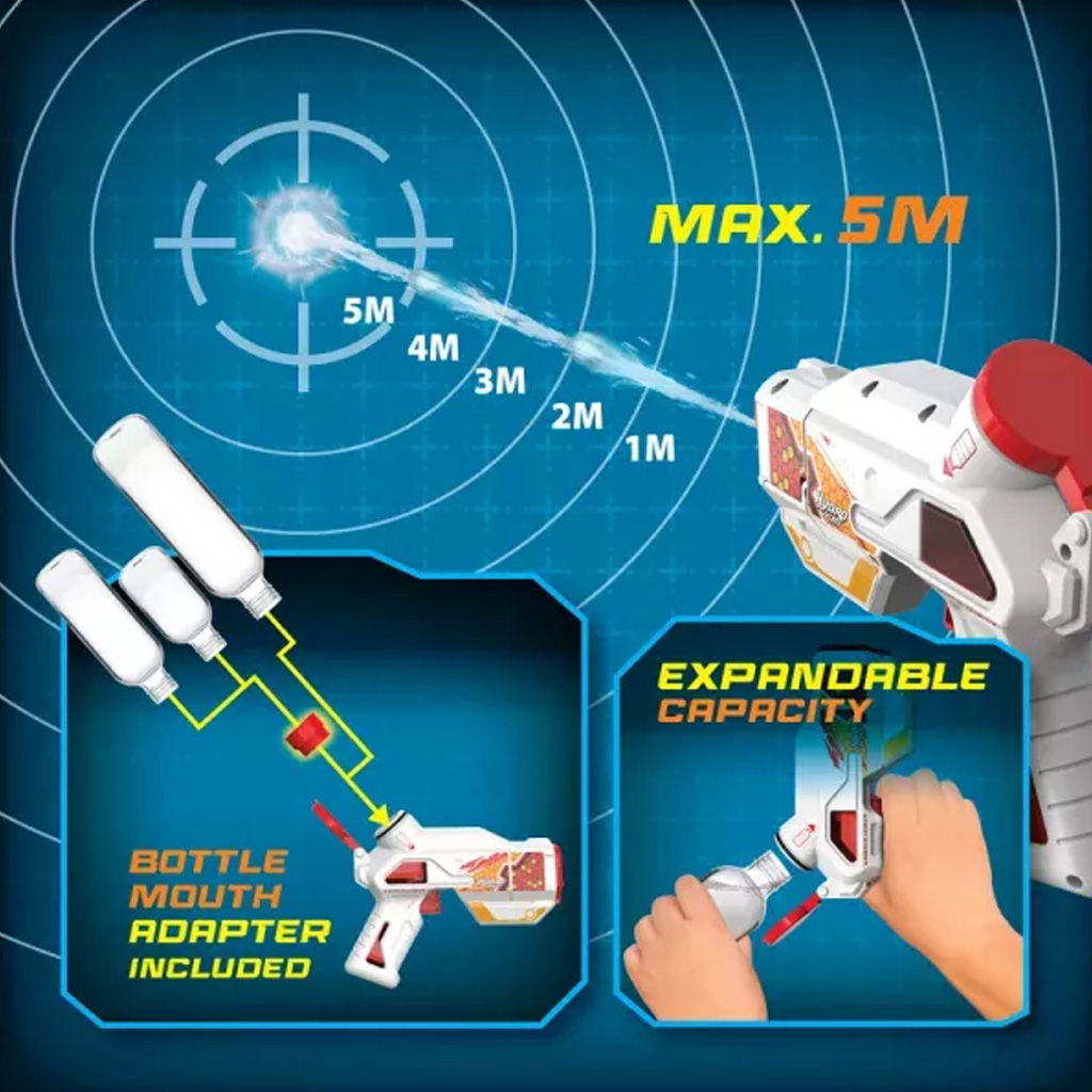 Adaptorul practic pentru conectarea sticlelor permite atașarea sticlelor de diferite dimensiuni, astfel capacitatea rezervorului de apă poate fi extinsă după necesitate. Acest lucru este deosebit de util în timpul jocurilor mai lungi, când dorim să reumplem mai rar. Designul ușor și ergonomic oferă o prindere sigură, astfel copiii îl pot folosi confortabil pentru perioade mai lungi.