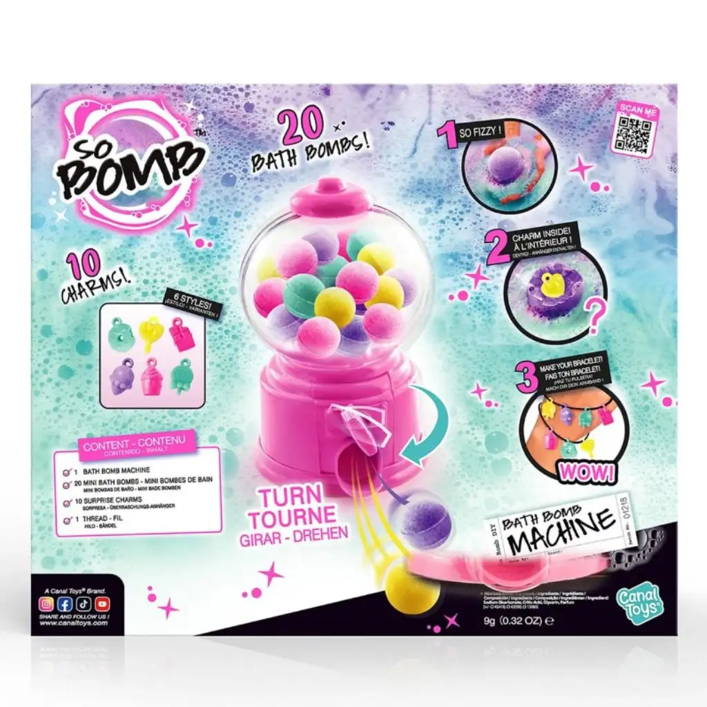Bomba de baie So Bomb în dozatorul de bile este o alegere fantastică dacă dorești să transformi baia într-o experiență specială! Bilele de baie colorate, efervescente și parfumate creează o atmosferă de wellness autentică, pe care copiii o vor adora cu siguranță. Setul conține 20 de bile de baie, dintre care 10 ascund și un charm surpriză. Aceste mici decorațiuni magice au forme de dulciuri preferate, cum ar fi înghețată, gogoși, acadele sau ciocolată, și pot fi înșirate pe un lanț sau brățară. Dozatorul interesant de bile este ușor de reumplut, astfel încât distracția poate continua oricând! Setul de bile de baie So Bomb nu este doar distractiv, ci oferă și o activitate creativă și relaxantă, fiind un cadou ideal pentru copiii de la 6 ani în sus.
