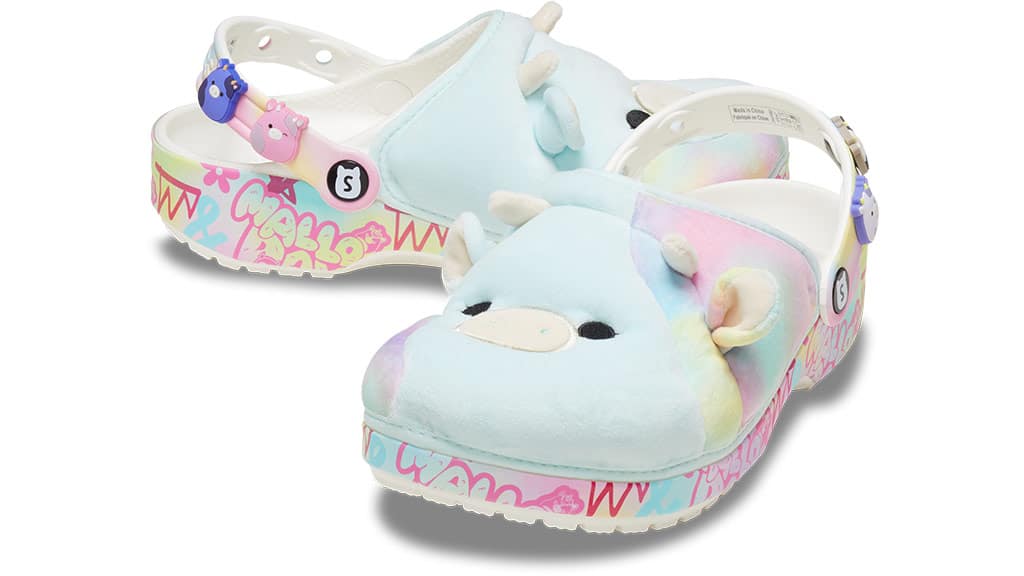 Copiii mai mari și adulții pot purta sandalele Cam Cozzzy și saboții Caedia Classic. Sandalele Cam the Cat Cozzzy au o căptușeală super moale și sunt decorate cu imprimeul complet al iconiței Squishmallows. Saboții Caedia Classic au partea superioară din pluș, cu Caedia the Cow, imprimeuri în stil graffiti pe tălpi și curele de călcâi dotate cu Jibbitz iconic Squishmallows în formă de vacă.