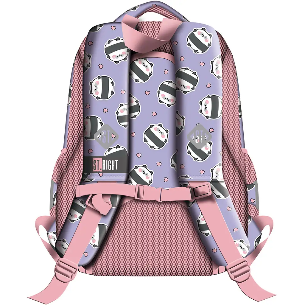 Rucsacul școlar St.Right Happy Panda BP26 este alegerea perfectă dacă copilul tău adoră modelele drăguțe și designul vesel, colorat! Pe fundalul lila pal sunt decorați simpatici ursuleți panda și inimioare roz, ceea ce cu siguranță va aduce zâmbetul pe fața tuturor. Partea din față a rucsacului este înfrumusețată de un ponpon roz, moale, care îl face și mai jucăuș și special – copilul tău îl va adora.