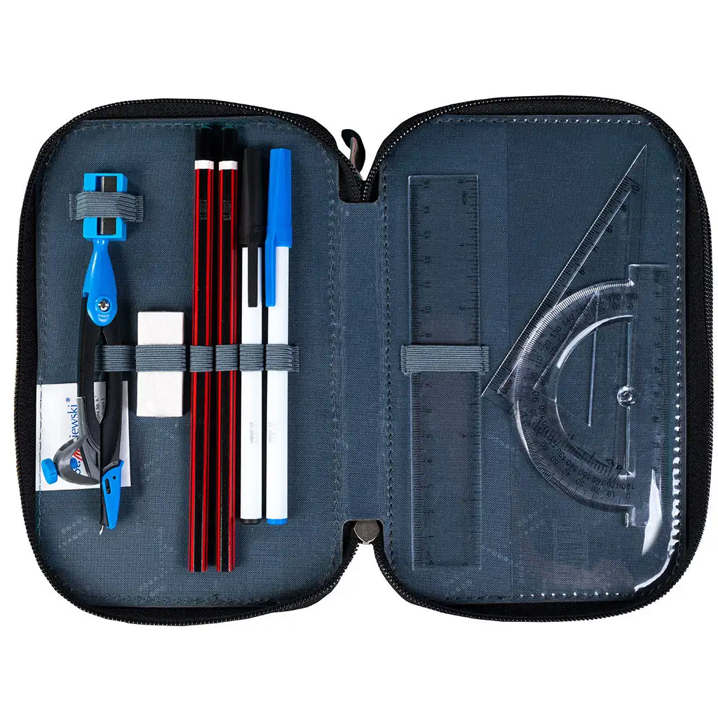 - Conținut: 18 creioane colorate, 9 carioci, compas, ascuțitoare, radieră, 2 creioane, 2 pixuri, riglă, echer, raportor