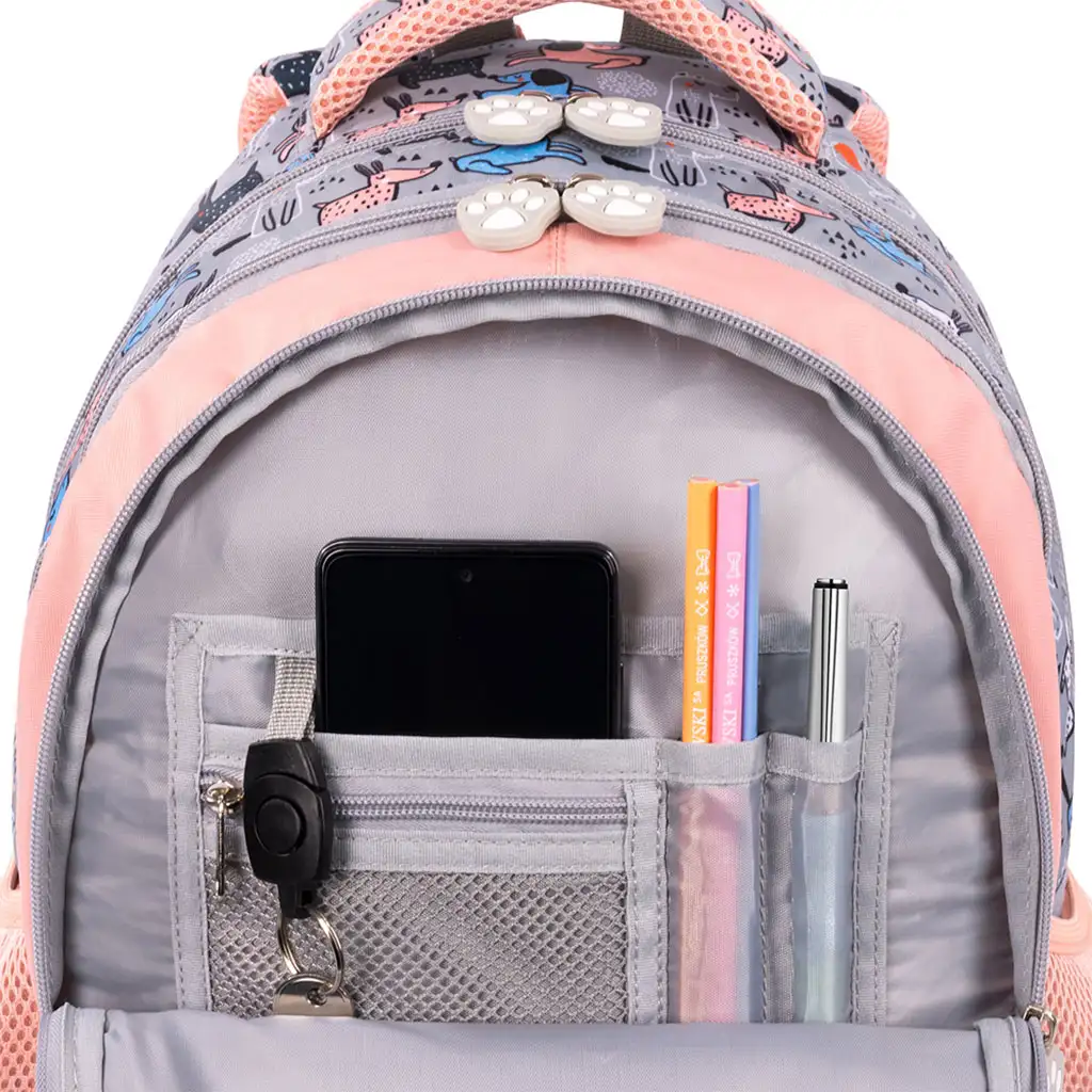Exteriorul rucsacului este decorat cu modele vesele de câini, care cu siguranță vor fi pe placul copilului tău. Cele patru compartimente separate oferă suficient spațiu pentru manuale, caiete și alte rechizite școlare, menținând totul organizat. Cele două buzunare laterale elastice sunt ideale pentru sticla de apă sau obiecte mai mici.