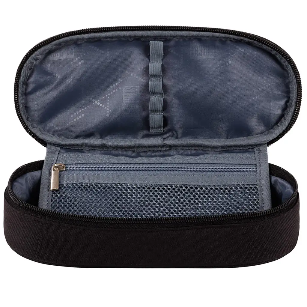 Designul penarului este extrem de practic și funcțional. Dispune de un compartiment principal spațios, în care pot fi depozitate cu ușurință creioane, pixuri, radiere și alte articole de papetărie. În interior se află un buzunar cu plasă cu fermoar, ideal pentru depozitarea obiectelor mai mici, cum ar fi ascuțitori sau radiere, precum și benzi de fixare care ajută la menținerea ordonată a pixurilor și creioanelor. Astfel, acestea vor fi întotdeauna ușor accesibile atunci când ai nevoie de ele.