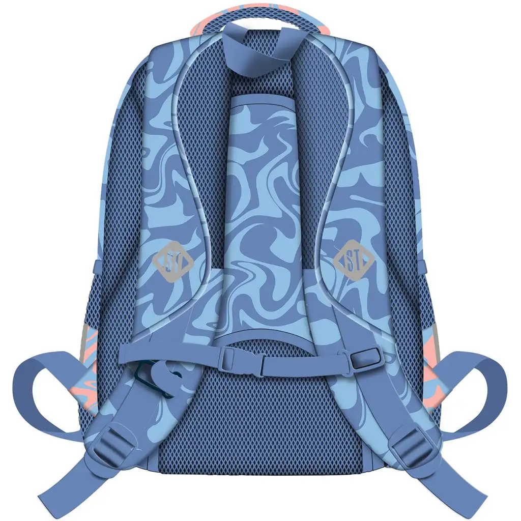 Ghiozdanul St.Right Romantic Horse pentru școală este o alegere de vis pentru orice elevă mică pasionată de cai. Ghiozdanul are un design spectaculos, în stil romantic, cu o grafică ce prezintă un frumos cap de cal maro și un model floral colorat. Fundalul în nuanțe de albastru deschis și piersică, cu modele ondulate, oferă un aspect unic, transformând rucsacul într-un accesoriu special pentru orice ținută școlară.