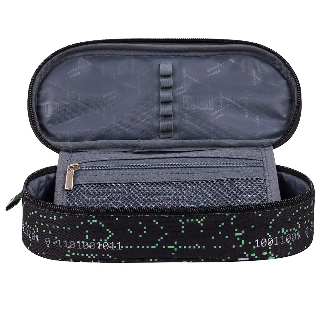 Aspectul penarului oval din colecția VR Gamer este modern și dinamic. Culorile vibrante și grafica dinamică sporesc stilul unic, în timp ce capacul pliabil și fermoarul oferă o soluție practică pentru depozitarea în siguranță a instrumentelor de scris.