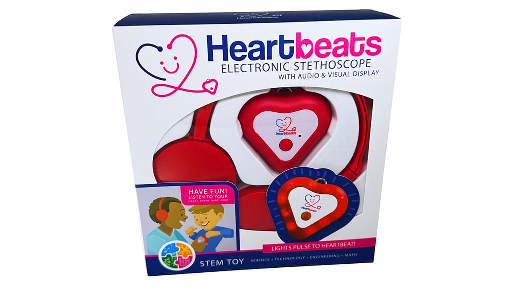 Stetoscopul electronic Heartbeats Brand, destinat copiilor de 5 ani și mai mari, reprezintă o nouă abordare a instrumentelor medicale pentru copii care se joacă de-a doctorul. În locul căștilor și clopotului tradițional al stetoscopului, această jucărie STEM este echipată cu căști care se așează pe urechi și un clopot în formă de inimă, care transmite pulsuri, inclusiv bătăi ale inimii și alte vibrații, printr-un cablu aux către căști. Copiii pot folosi Stetoscopul Electronic pentru a-și asculta propriile bătăi ale inimii, dar setul include și un ghid care prezintă alte activități educaționale pe care copiii le pot face cu stetoscopul, cum ar fi ascultarea sunetelor din gospodărie, jocuri de activitate, navigarea prin labirinturi și multe altele. Setul include și o curea de încheietură, astfel încât copiii să poată avea întotdeauna la îndemână clopotul electronic.