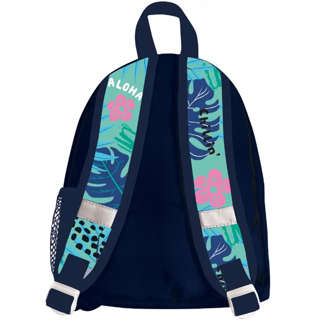 Rucsacul are două compartimente cu fermoar, astfel încât lucrurile pot fi ușor organizate. Bretelele confortabile și căptușite sunt reglabile, astfel încât se pot potrivi perfect la mărimea copilului. Benzile reflectorizante de pe bretele asigură siguranța chiar și în condiții de vizibilitate redusă. Spatele și bretelele au un model vesel, tropical, astfel încât rucsacul este spectaculos și jucăuș din orice unghi.