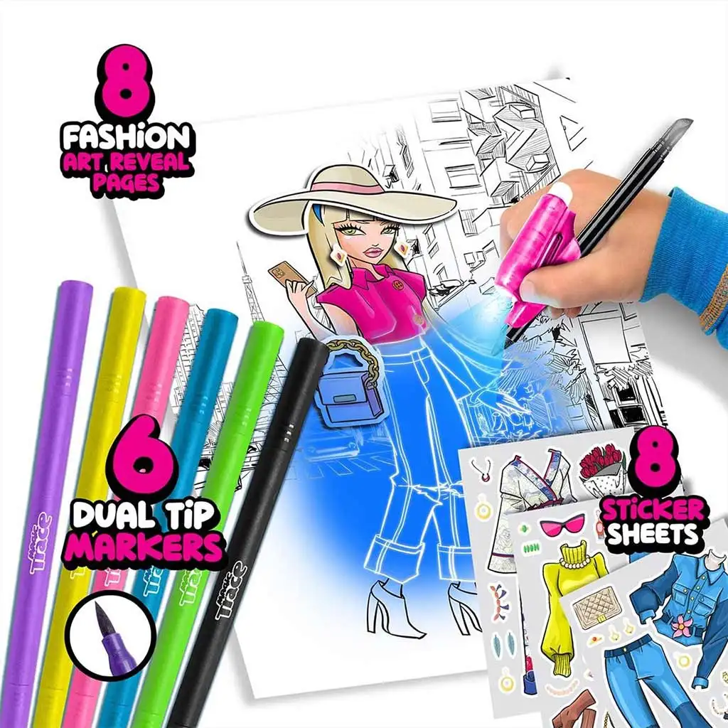 Creează-ți propria colecție de modă cu setul de începător Magic Trace Studio – Desen strălucitor, unde linii secrete apar ca prin magie, ca și cum ai ține în mână o baghetă magică reală! Paginile pachetului par goale la prima vedere, dar de îndată ce pui markerul pe hârtie și aprinzi lampa, o lume nouă se deschide în fața ta.
