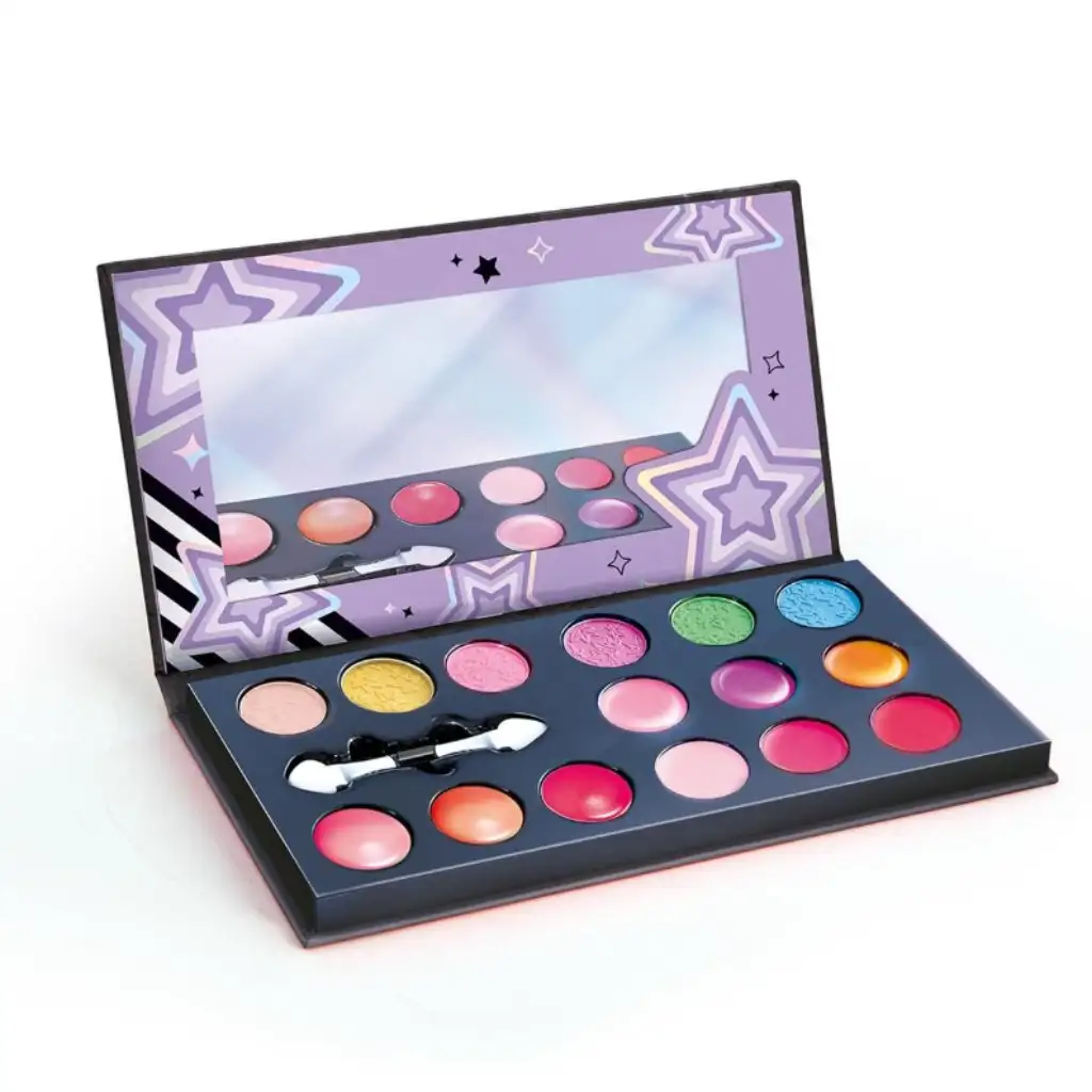 Setul de machiaj Style 4 Ever este primul pas perfect în lumea modei și a machiajului! Cu acest set, copiii pot exersa cu ușurință bazele machiajului, deoarece tava mai mare și mai stabilă facilitează utilizarea pensulei. Setul include 6 farduri de pleoape diferite, 6 luciuri de buze și 3 farduri de obraz, oferind astfel multe combinații pentru experimentare. Cu ajutorul oglinzii încorporate, pot urmări procesul de creare a machiajului pentru a obține un rezultat perfect. Pensula cu două capete facilitează însușirea mișcărilor fine, astfel încât copiii să-și poată încerca creativitatea cu încredere.