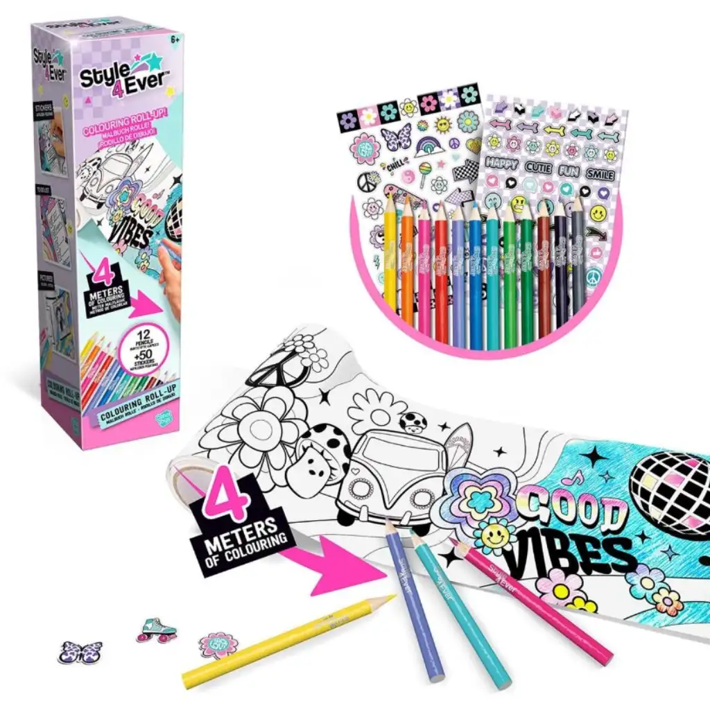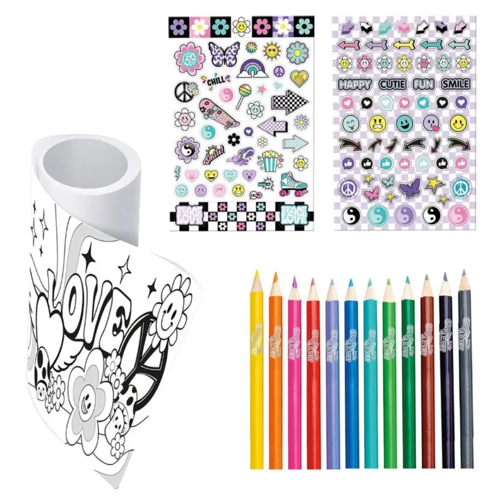 Posterul decorativ Style 4 Ever este alegerea perfectă dacă dorești să înveselești pereții goi ai camerei copiilor și să îți eliberezi creativitatea! În cutie vei găsi un poster de 4 metri lungime, plin de modele, ilustrații și siluete interesante, pe care le poți colora după bunul plac. Pachetul include și 12 creioane colorate vibrante, pentru a face posterul cu adevărat strălucitor. Amestecul de culori galben, roșu, albastru, verde și alte nuanțe va capta cu siguranță atenția copiilor și va transforma orice vis de colorat în realitate. Posterul vine și cu 50 de autocolante super, care vor face creația și mai spectaculoasă. În plus, pe anumite părți speciale ale posterului poți lipi fotografii de prieteni sau scrie mesaje motivaționale, transformându-l astfel într-o decorațiune cu adevărat unică.