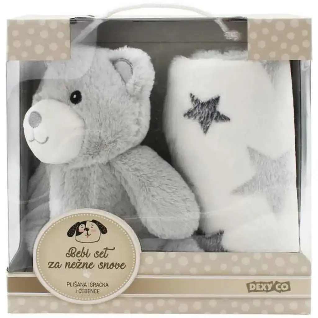 SweetDreams: Setul cu pătură și ursuleț de pluș, în culoare gri, este un cadou cu adevărat liniștitor și practic pentru nou-născuți, format dintr-un ursuleț de pluș adorabil și o pătură moale, cu model de stele. Datorită designului său simplu, modern și combinației de culori atemporale, este alegerea perfectă atât pentru băieți, cât și pentru fete – fie că este vorba despre propriul tău copil sau despre bebelușul unui prieten drag.