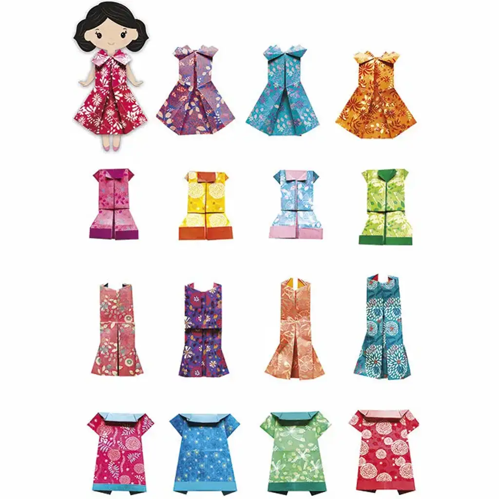 Pachetul conține o păpușă decupată din carton, precum și o varietate de hârtii frumoase cu modele, din care pot fi ușor pliate diferite articole de îmbrăcăminte. Fiecare haină are o paletă de culori și un stil unic, astfel încât copiii pot crea o adevărată colecție de modă pentru păpușă – de la rochii de seară clasice la rochii de vară vesele. Un ghid ilustrat pas cu pas facilitează învățarea ușoară, chiar și pentru cei care sunt la început cu origami-ul.