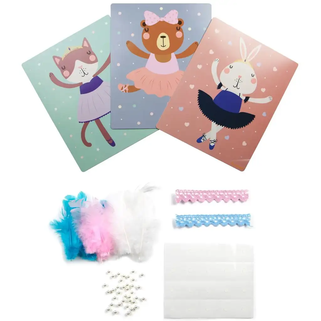 Setul conține toate materialele necesare, de la pene la mărgele și panglici de dantelă, până la puncte adezive, oferind tot ce este necesar pentru o după-amiază creativă și distractivă. Sarcina este simplă: urmează modelul sau lasă-ți copilul să-și elibereze imaginația și să decoreze micile balerine în stilul său propriu. În timpul activității creative, se dezvoltă motricitatea fină, îndemânarea, concentrarea și simțul estetic.