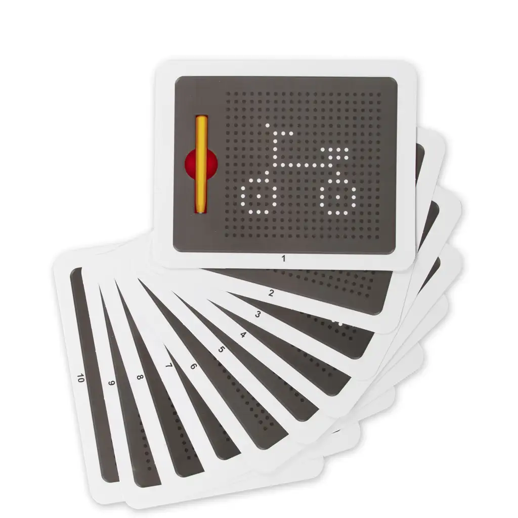 Tabla magnetică de desen cu bile și stilou oferă copilului tău o experiență de desen specială și creativă. Pe tablă se află bile metalice mici, care pot fi ridicate la suprafață cu ajutorul stiloului magnetic, astfel apărând desenele și modelele. Cu ajutorul cartonașelor cu modele incluse, copiii pot urma cu ușurință figurile sau pot crea după propria imaginație. După realizarea desenului, bilele pot fi împinse pur și simplu înapoi la locul lor, astfel tabla poate fi folosită din nou și din nou. Jocul dezvoltă foarte bine motricitatea fină, îndemânarea manuală și concentrarea, în timp ce îi introduce pe copii într-un mod distractiv în lumea desenului și a formelor. Este o alegere excelentă pentru joaca acasă, la drum sau ca dar.