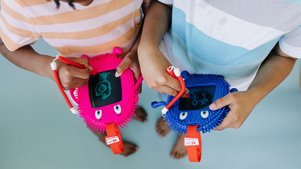 Aceste tablete de desen Boogie Board, cunoscute sub numele de Squiggle (roz) și Spike (albastru), sunt parteneri senzoriali minunați care ajută la focalizarea și relaxarea minților anxioase și a mâinilor neliniștite. Cu un ecran texturat și o carcasă de silicon, copiii pot desena și scrie orice pe ecran, apoi pot șterge cu o simplă apăsare de buton. Clema de silicon se poate atașa cu ușurință la rucsacuri, genți de prânz și multe altele, astfel încât micul prieten să fie mereu la îndemână!