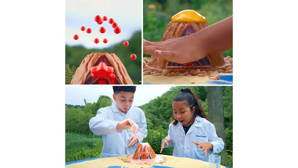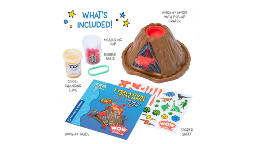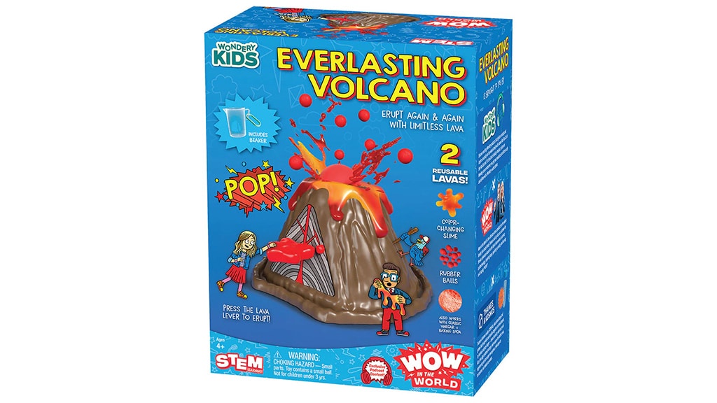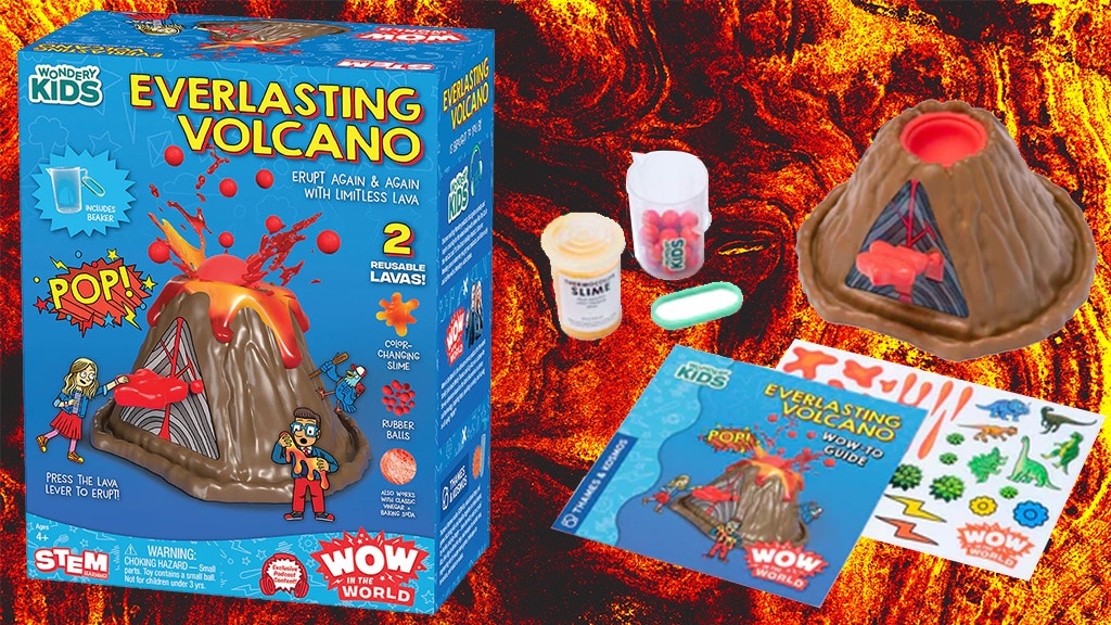 Setul științific reutilizabil Thames & Kosmos Vulcanul Etern erupe din nou și din nou. Ca parte a seriei Wow in the World, acest set științific este creat pe baza podcastului științific premiat, destinat copiilor și adulților. Copiii pot umple vulcanul cu slime colorat, bile mici de cauciuc sau oțet și bicarbonat de sodiu pentru a provoca o erupție științifică. Cu slime și bile de cauciuc, vulcanul erupe ușor prin apăsarea unui braț. Setul include un ghid complet color, de opt pagini, care conține instrucțiuni și fapte distractive despre reacțiile științifice și vulcanologie.