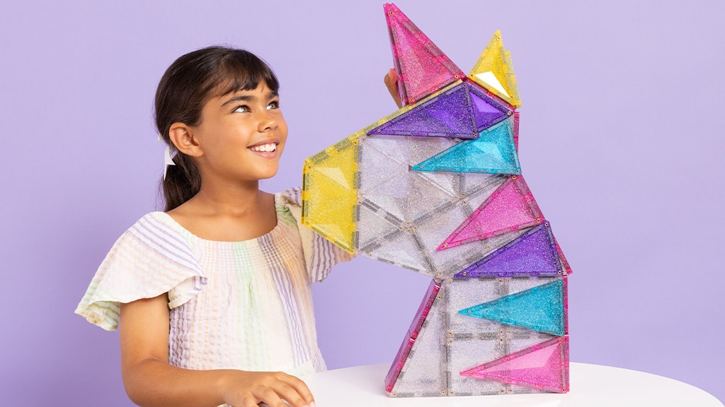 Pachetul cu 56 de piese Unicorni Strălucitori este gata să aducă aventuri pline de fantezie în jocurile copiilor. Cei mici pot descoperi noi posibilități de construcție în timp ce creează un unicorn sclipitor din plăci transparente și viu colorate, cu sclipici în culorile curcubeului. Constructorii pot folosi diferite forme – de exemplu hexagoane, dreptunghiuri, triunghiuri și trapeze – pentru a-și crea noul și magic prieten cabalin. Acest set nu doar dezvoltă creativitatea și abilitățile motorii fine, ci oferă și ore întregi de distracție, timp în care copiii pot inventa și realiza propriile povești unice. Elementele strălucitoare fac creațiile și mai speciale, astfel încât fiecare copil își poate prezenta cu mândrie propriul unicorn colorat.Aceste pachete cu tematică sclipitoare nu sunt destinate doar castelelor și unicornilor. Fiecare pachet deschide porțile creativității și stimulează învățarea STEAM cu fiecare conexiune magnetică. În plus, copiii creativi pot combina elementele sclipitoare cu alte pachete și seturi Connetix, oferind astfel și mai multe oportunități pentru creație și învățare.