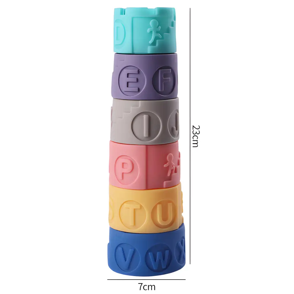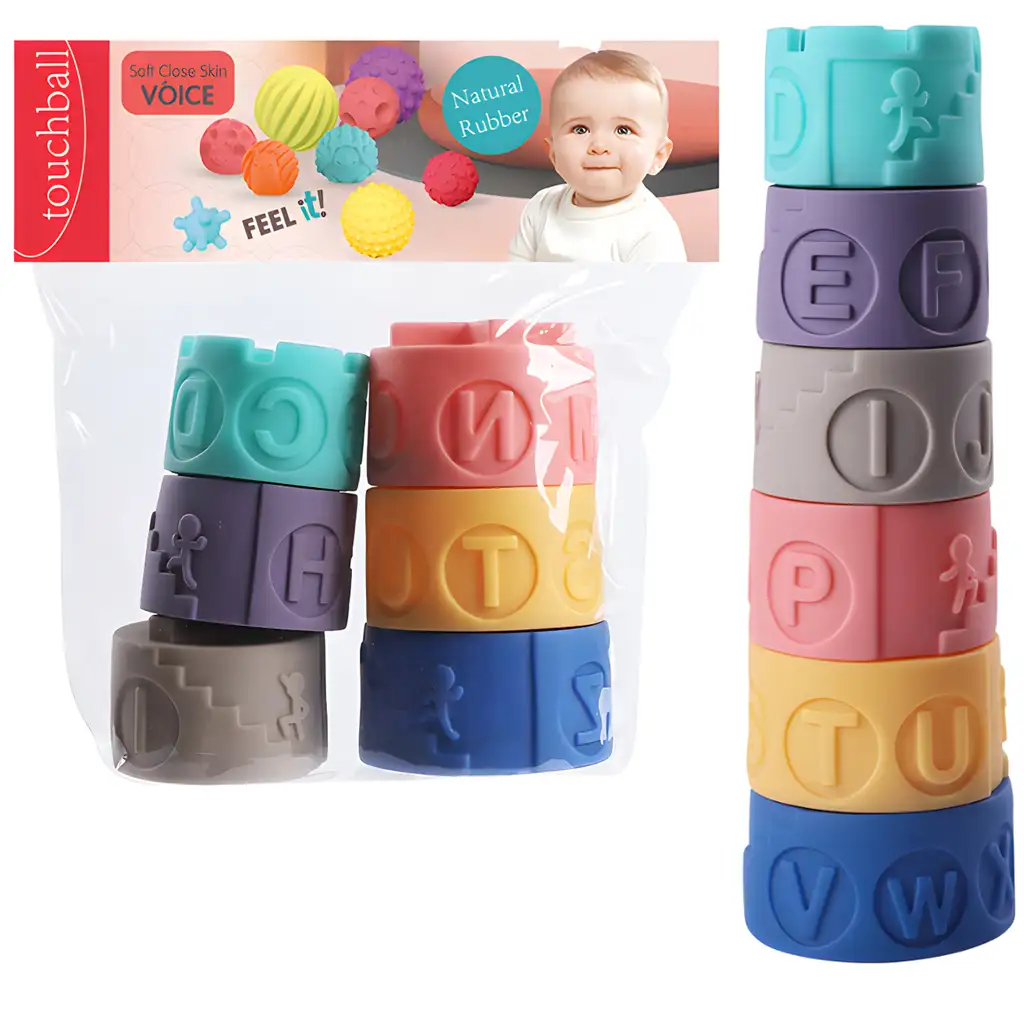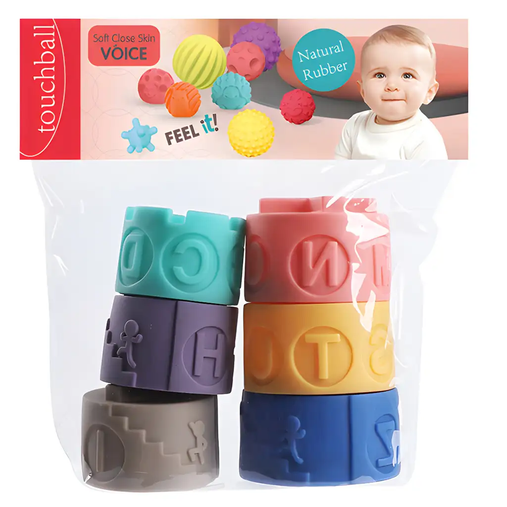 Un set de construcție moale pentru dezvoltarea simțului tactil oferă o oportunitate excelentă copilului tău pentru a-și dezvolta creativitatea și abilitățile motorii. Setul conține 6 elemente de construcție cilindrice moi, de diferite culori, fiecare având modele unice de litere pentru a oferi o experiență tactilă interesantă.