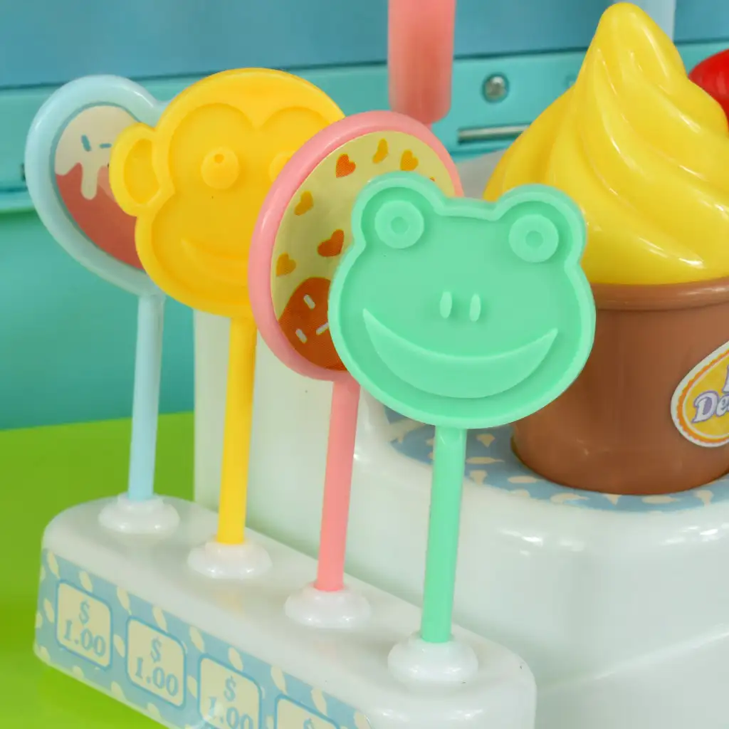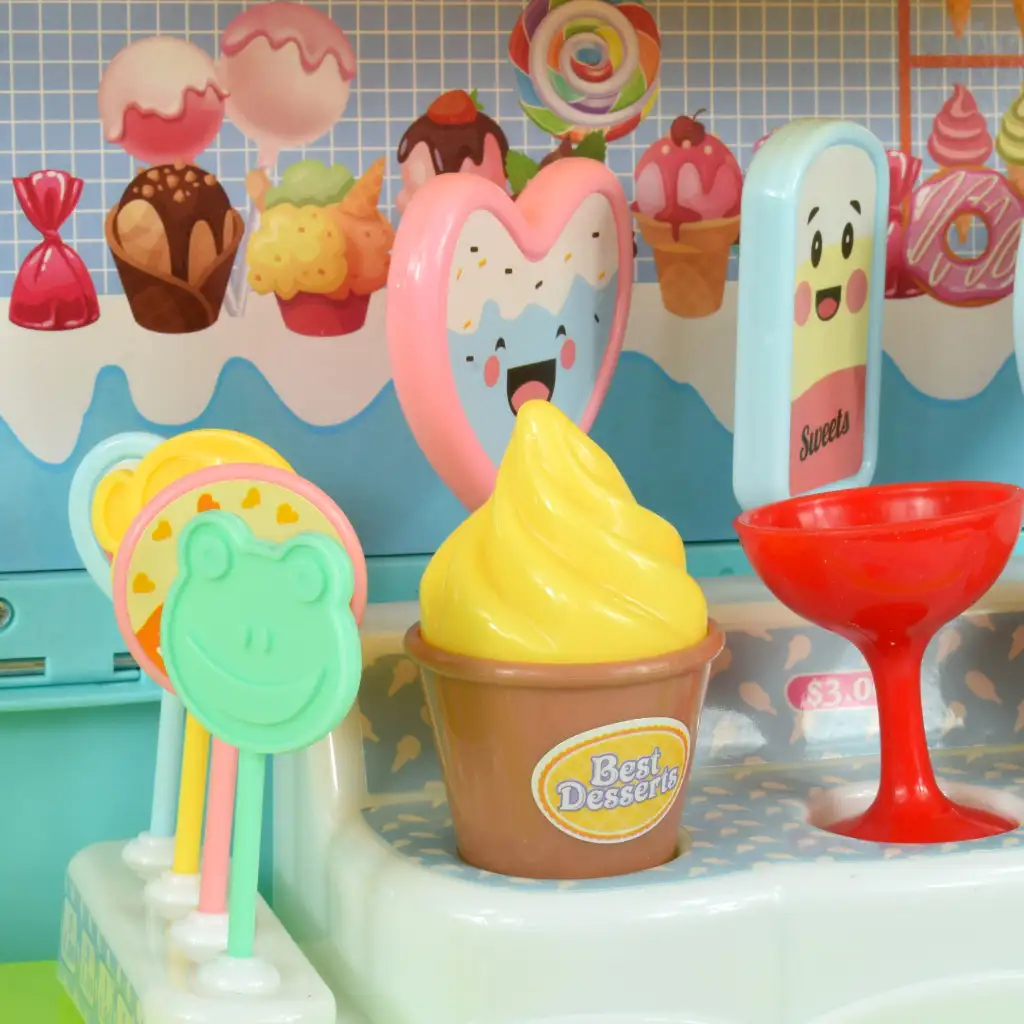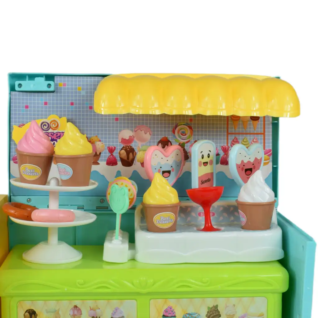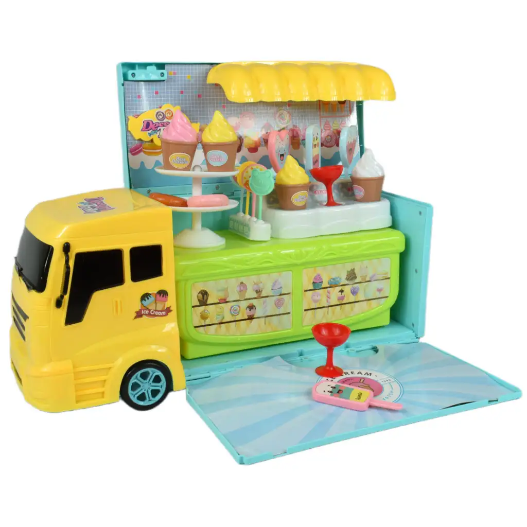 Surpriza reală vine însă atunci când deschidem compartimentul de marfă al camionului. Din spatele ferestrelor, se dezvăluie un stand de patiserie impresionant, cu delicatese aliniate, gata să devină deserturi imaginare pentru cei mici. În mașină se găsesc înghețată, gelato și acadele, astfel încât copiii au posibilități infinite de a se juca creativ și de a-și pregăti propriile delicatese.