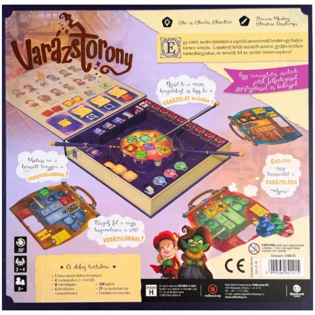 Turnul Magic este un joc de societate tactic, ușor de învățat, ascuns într-o cutie de carte de basm, în care aventurați într-un turn misterios și amenințător. Parcurgând nivel după nivel, explorați camerele, adunați obiecte magice valoroase și vă pregătiți pentru confruntarea finală cu vrăjitorii întunecați ce vă așteaptă în criptă. În fiecare rundă alegeți un jeton pe care vreți să-l obțineți, apoi îl indicați simultan cu bagheta voastră magică – sincronizarea corectă și asumarea riscurilor sunt răsplătite sub formă de aur, ingrediente, arme și vrăji.