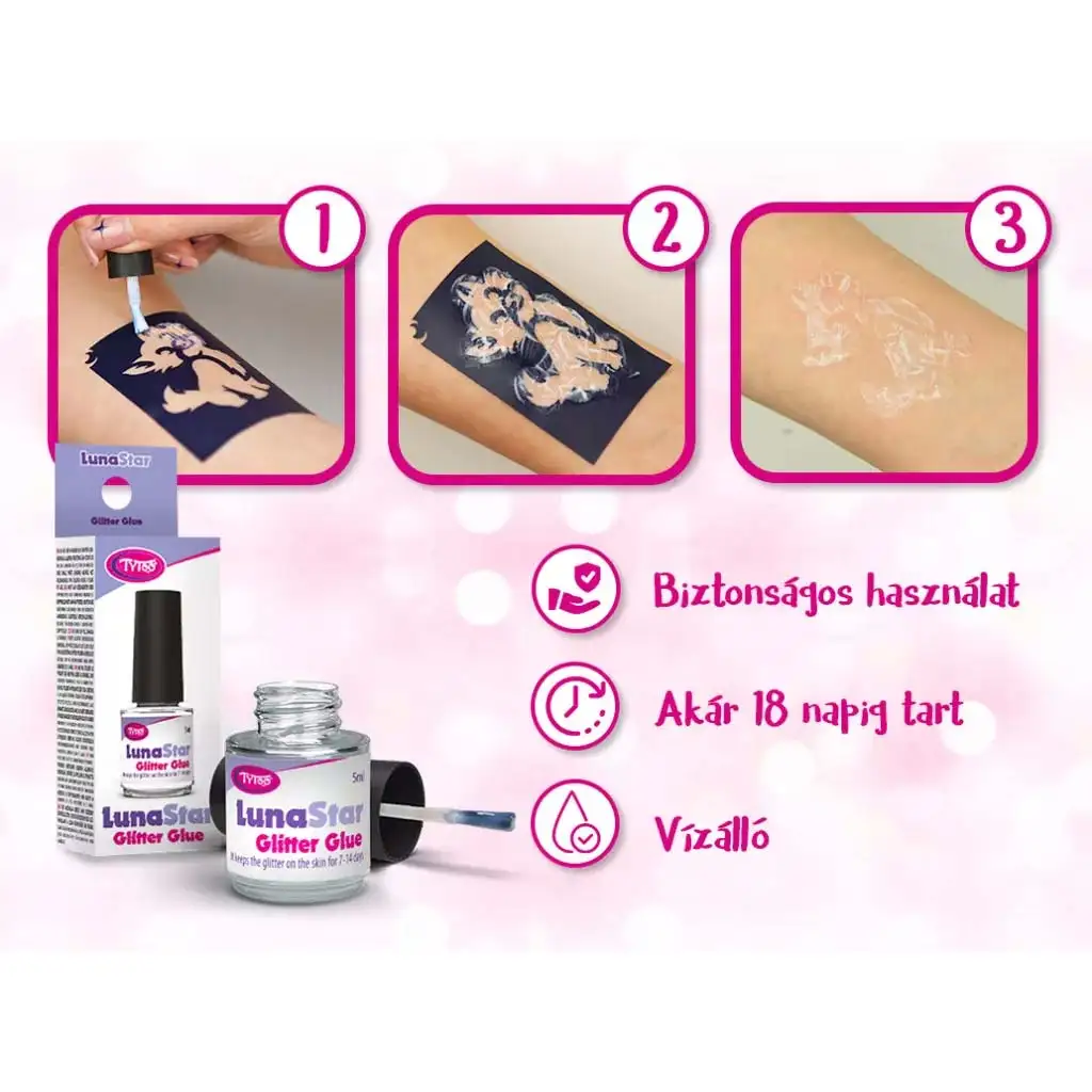 Produsul este prietenos cu pielea și sigur, astfel poate fi folosit cu încredere chiar și pentru copiii mai mici. Timpul de uscare este rapid, nu se lipește și este rezistent la apă, astfel încât opera de artă nu dispare nici după baie sau în caz de transpirație. Funcționează perfect atât cu șabloane, cât și pentru creații desenate liber. Dacă vrei să realizezi tatuaje colorate și strălucitoare acasă, care să decoreze pielea copilului o perioadă îndelungată, cu adezivul LunaStar cu siguranță nu vei da greș.