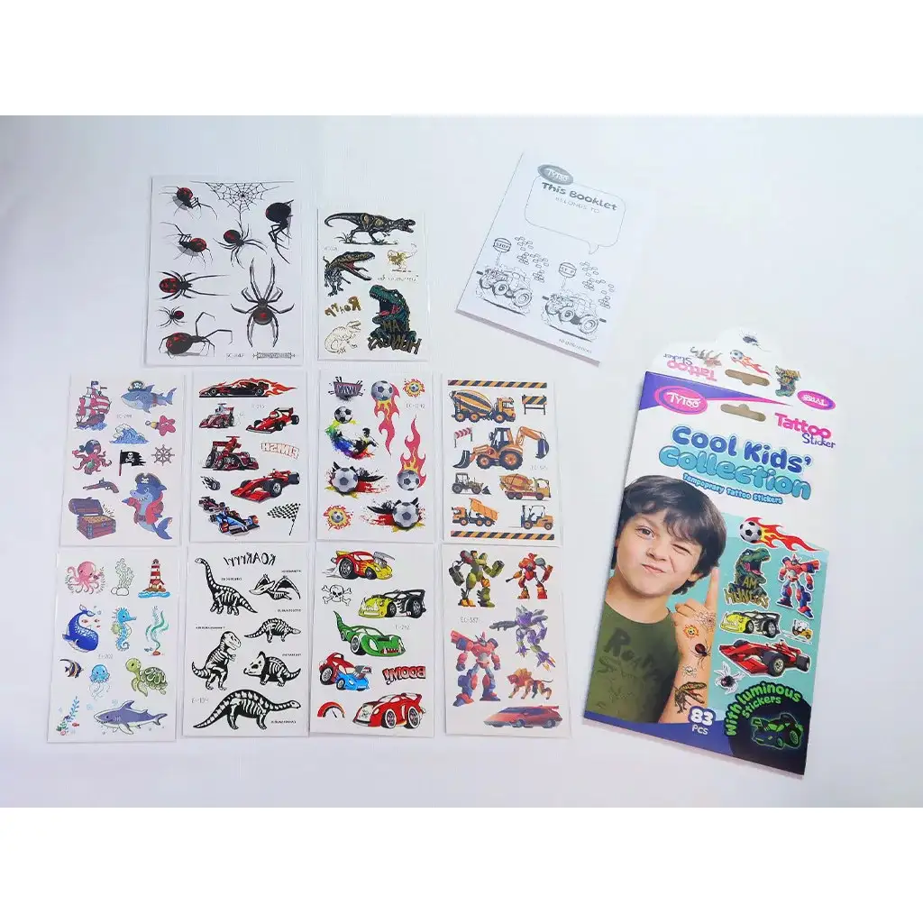 Fă zilele obișnuite mai interesante cu acest set cool de autocolante de tatuaj, format din 83 de piese, creat special pentru copiii curajoși și creativi! Setul Cool Kids’ Collection este plin de mașini, dinozauri, păianjeni, pirați, mingi de fotbal, utilaje de construcții, roboți și multe alte modele captivante – garantăm că fiecare băiat își va găsi preferatul! Printre autocolante se găsesc modele fosforescente, metalizate și cu aplicare instantanee, astfel că joaca și auto-exprimarea nu devin niciodată plictisitoare.