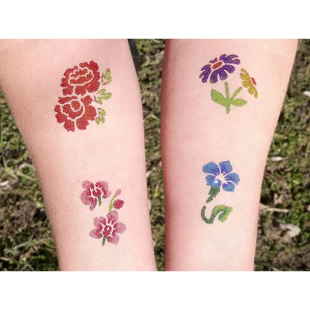 Sclipiciurile de calitate cosmetică, prietenoase cu pielea, aderă excelent și, folosite corect, pot dura chiar și câteva zile pe piele. Fie că e vorba de modele cu flori, fluturi sau motive de supereroi, cu acest set fiecare își găsește preferatul. Sclipiciurile au acoperire bună, strălucesc intens în lumina soarelui și transformă tatuajele într-un adevărat spectacol vizual. În plus, sunt ușor de folosit: puțin lipici, un șablon și distracția poate începe!