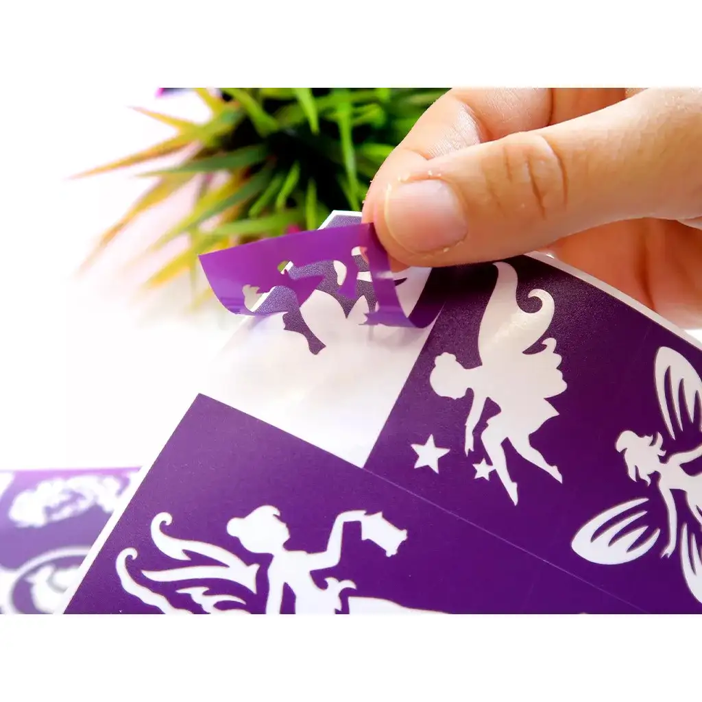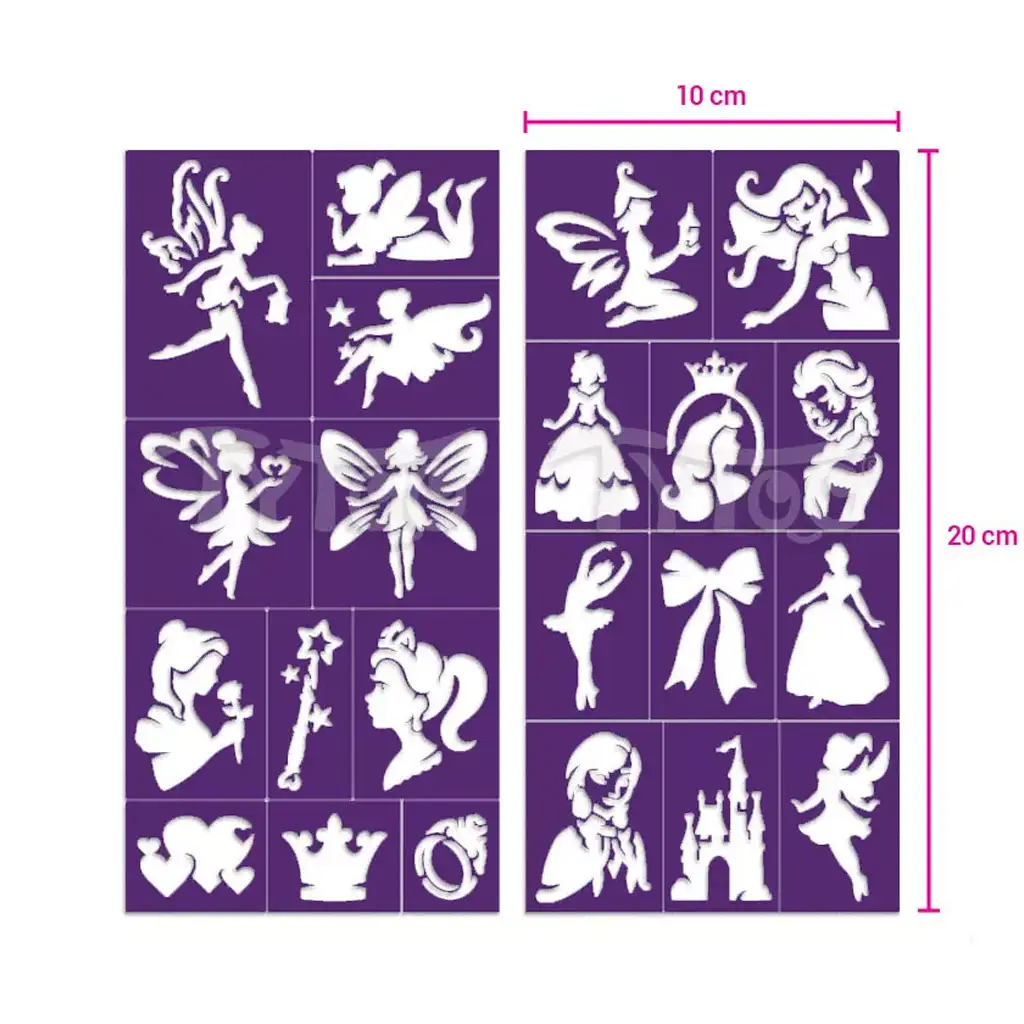 Acest set de șabloane este alegerea perfectă pentru orice mic visător care dorește să se ascundă în spatele unor aripi de zână sau să se imagineze ca un personaj de basm în pielea unei prințese. Șabloanele autoadezive se aplică ușor pe piele și, completate cu sclipici sau vopsea pentru corp, vă permit să creați tatuaje spectaculoase, colorate și strălucitoare. Adezivul se fixează bine, dar nu irită pielea, fiind astfel sigur de folosit și pentru copiii mai mici.