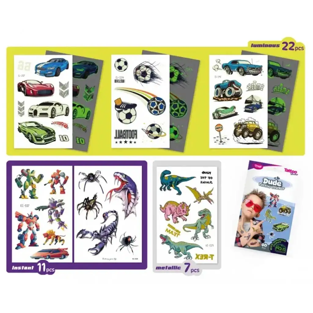 Setul de autocolante tatuaje Dude este un accesoriu îndrăzneț și captivant pentru orice copil aventuros! Acest set de 40 de piese conține o mulțime de modele cool care cu siguranță îi vor impresiona pe băieți și prietenii lor. Printre tatuaje se regăsesc supermașini, dinozauri, roboți, păianjeni, dragoni și motive de fotbal, astfel încât fiecare își poate găsi preferatul. Particularitatea setului constă în faptul că include trei tipuri de tatuaje: autocolante fosforescente, metalice și tradiționale. Modelele fosforescente strălucesc în întuneric, oferind o experiență specială și pe timp de noapte. Tatuajele metalice creează un efect strălucitor, în timp ce autocolantele tradiționale se remarcă prin detalii bogate și modele colorate.