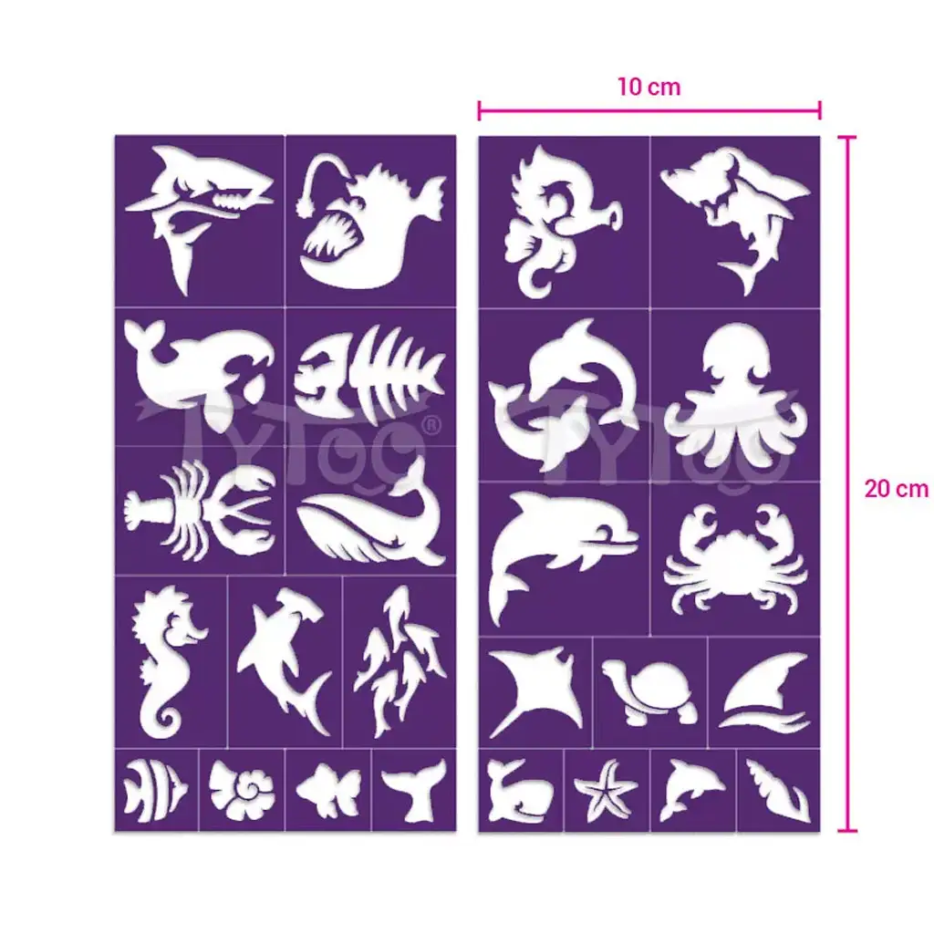 Printre modelele variate ale setului se regăsesc rechini, pisici de mare, caracatițe, delfini, stele de mare, crabi, sirene și multe alte viețuitoare marine. Șabloanele se aplică ușor pe piele, apoi se umplu cu sclipici sau vopsea pentru corp – și gata de purtat tatuajele marine unice și strălucitoare! Modelele nu sunt doar drăguțe și creative, ci și foarte detaliate, astfel încât rezultatul final va fi mereu spectaculos.