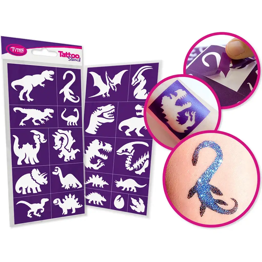 Șabloanele pot fi folosite de mai multe ori, astfel încât nu sunt doar o soluție creativă, ci și practică și economică; în plus, dezvoltă îndemânarea și imaginația copiilor. Tatuajul cu sclipici poate rezista chiar și câteva zile, astfel încât micii fani ai dinozaurilor pot purta cu mândrie micile lor opere de artă pe braț, picior sau chiar pe față.