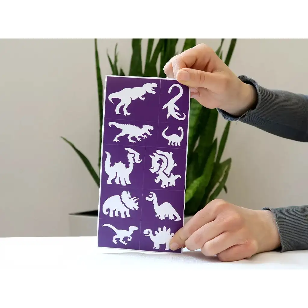 Setul include cei mai cunoscuți și îndrăgiți dinozauri, precum T-Rex, Stegosaurus, Triceratops sau Brontosaurus, dar și forme speciale de poveste și personaje „de desen animat” își găsesc locul în colecție. Șabloanele au partea din spate autoadezivă, astfel încât pot fi fixate ușor pe piele și asigură modele precise și clare. Realizarea tatuajului cu sclipici este simplă: trebuie doar să aplici șablonul, să presari sclipici peste, apoi să îndepărtezi folia – și gata, ai un dinozaur colorat!