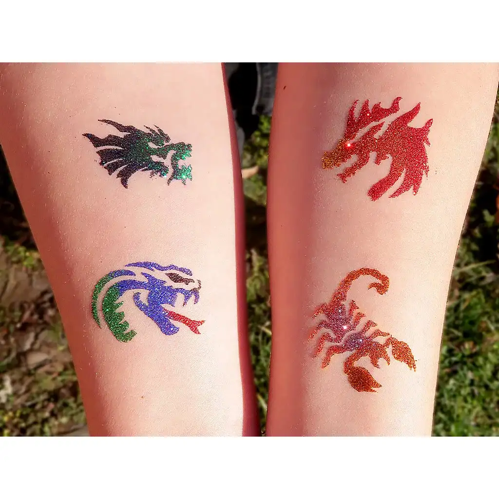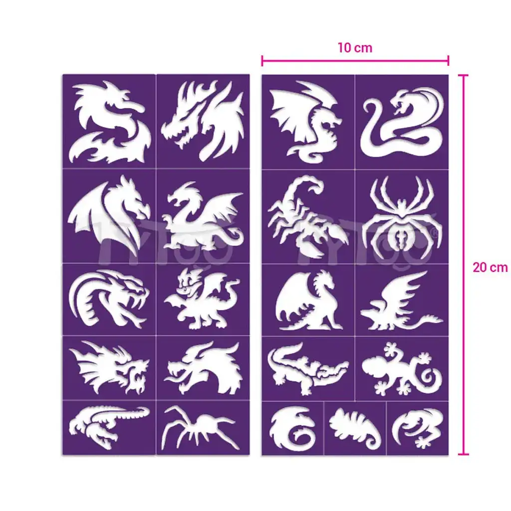 Dintre modelele setului fac parte dragoni clasici înaripați, șopârle prietenoase care amintesc de eroi de poveste și creaturi deosebite, cu desene ornamentale. Această diversitate oferă copiilor șansa de a-și ilustra din nou și din nou pe piele lumi fantastice diferite. Șabloanele sunt durabile și pot fi refolosite de mai multe ori, oferind distracție pe termen lung.