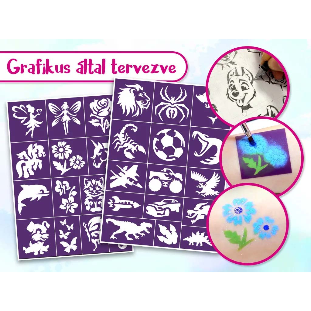 Vopselele vii pentru față, sclipiciul și accesoriile din set ajută ca rezultatul final să fie spectaculos și de durată. Utilizarea este simplă; vopselele se aplică și se îndepărtează ușor, așa că nu trebuie să-ți faci griji în privința curățeniei. O activitate minunată de făcut împreună, în timp ce imaginația copilului tău prinde aripi.