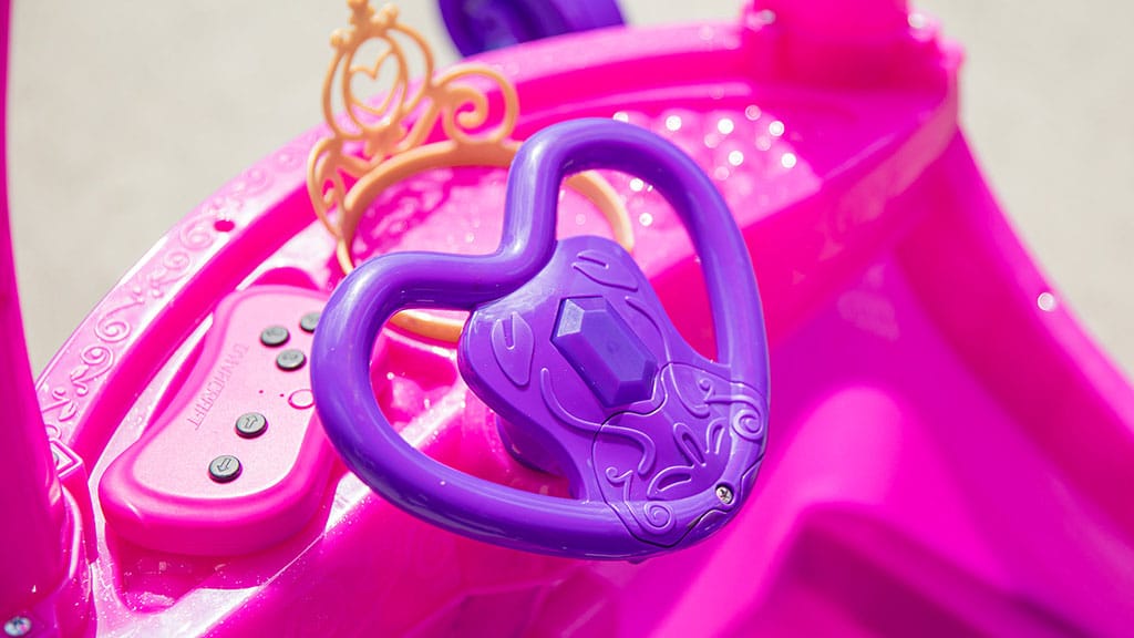 Mersul este surprinzător de lin, datorită benzilor de aderență din cauciuc și construcției masive, stabile. Panoul sonor, care poate fi activat prin apăsarea pietrei prețioase din centrul volanului, oferă o experiență suplimentară, magică. Această funcție specială face jocul și mai interesant, deoarece copiii pot asculta sunetele preferate în timp ce conduc.