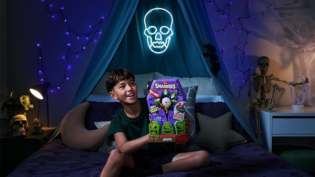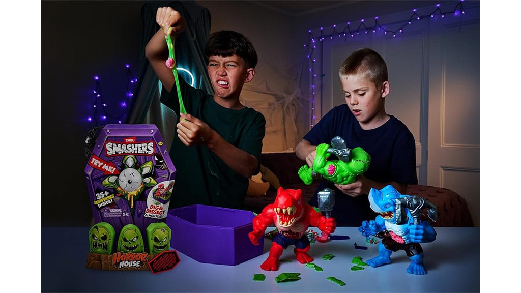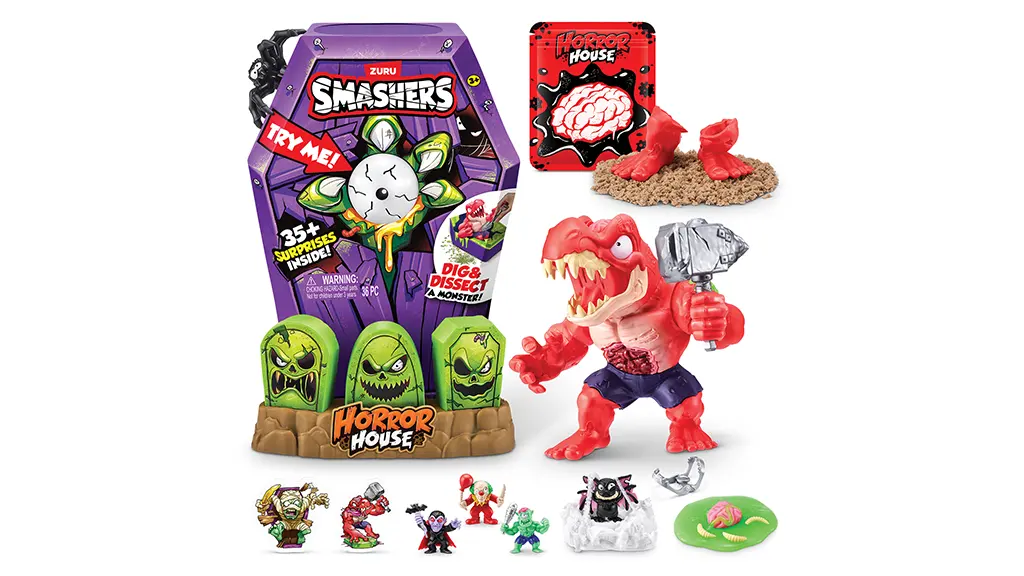 Proiectat pentru copii, de la vârsta de 3 ani, Smashers Mega Horror House de la ZURU este o experiență de despachetare care capătă dimensiuni înfricoșătoare. Copiii desfac surprizele, caută prin slime și nisip și deschid sicrie pentru a descoperi peste 35 de surprize, inclusiv mini figurine, autocolante și multe altele. Cel mai mare premiu din pachet este un Smasher Monstru! Trei Smasher Monștri pot fi colecționați: Zombie Rex, Blood Shark și Brain Dead. După ce copiii au asamblat toate piesele Smasher Monștrilor, trebuie să introducă creierul monstrului și să sape în interiorul său pentru a găsi ultima surpriză care îi așteaptă.